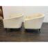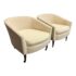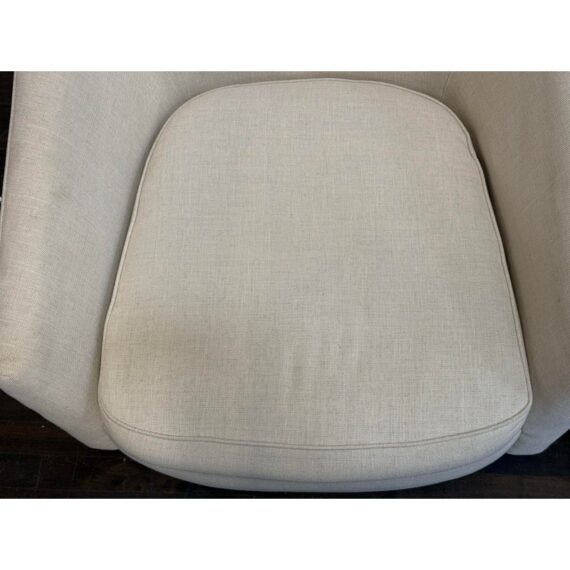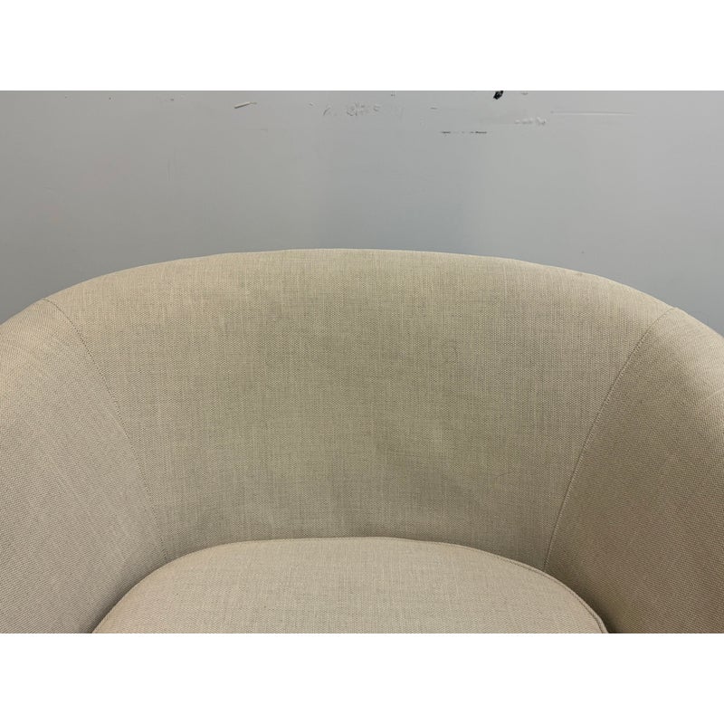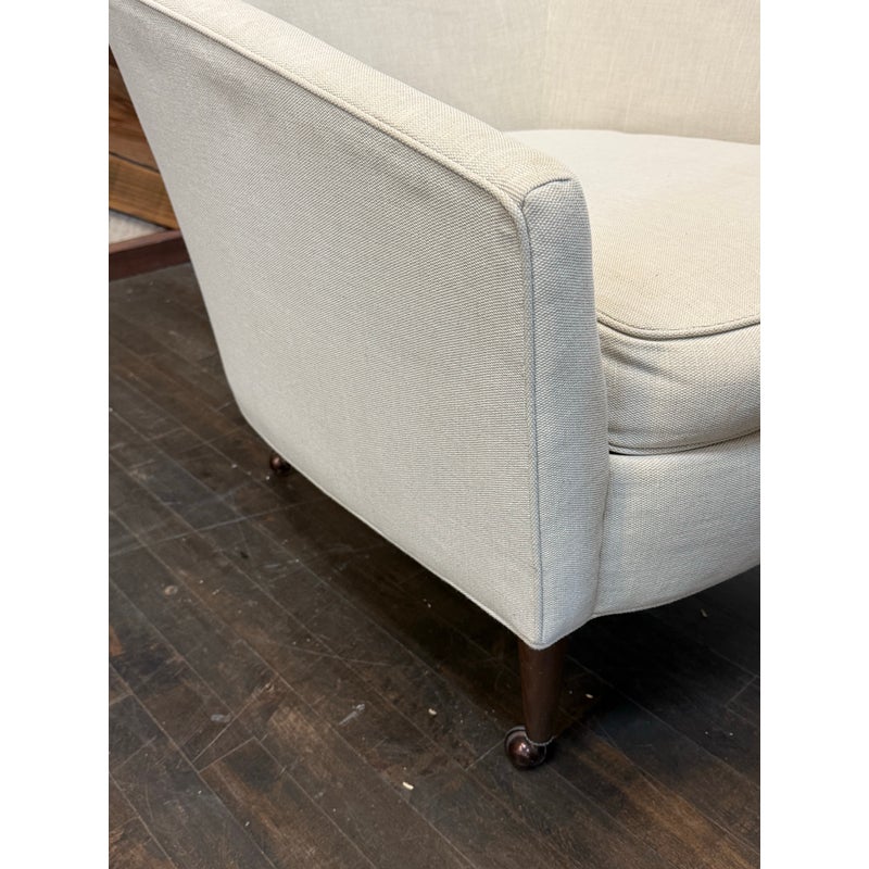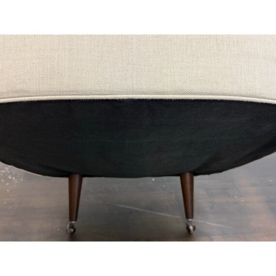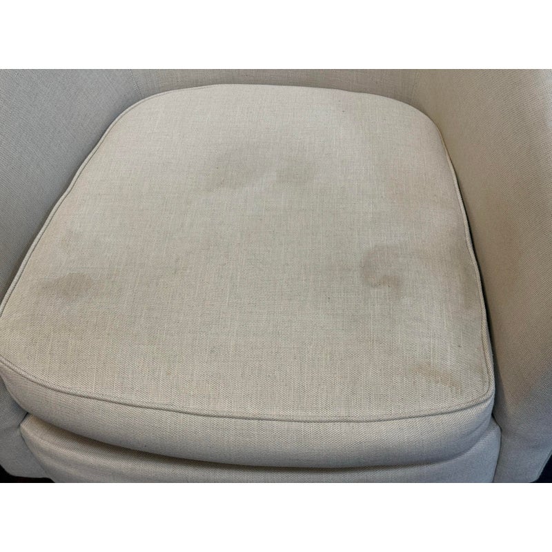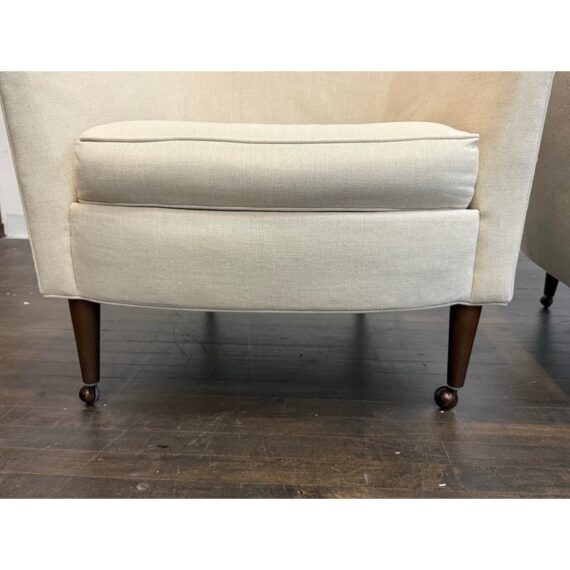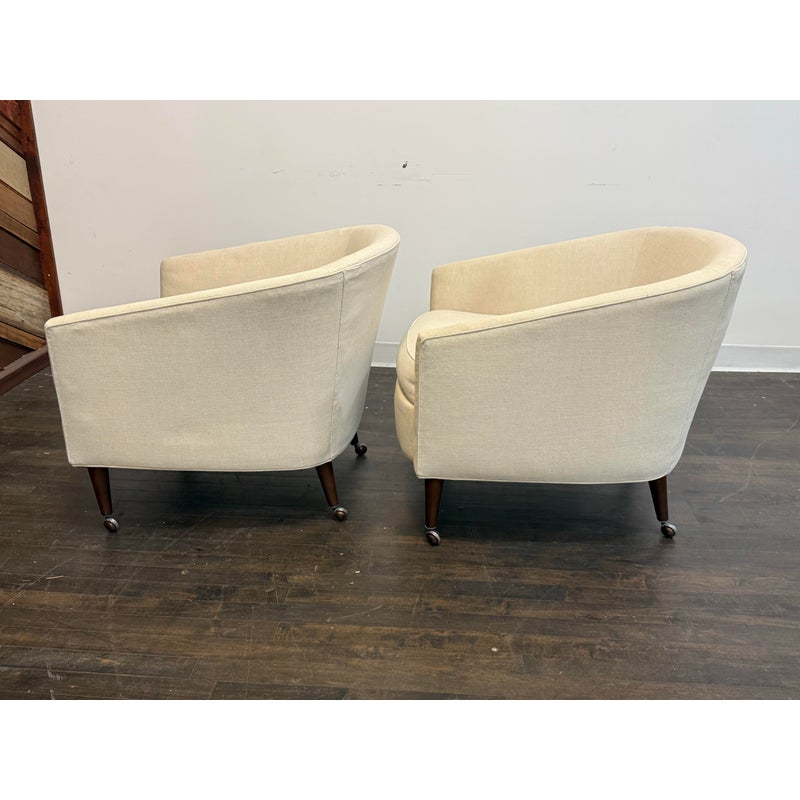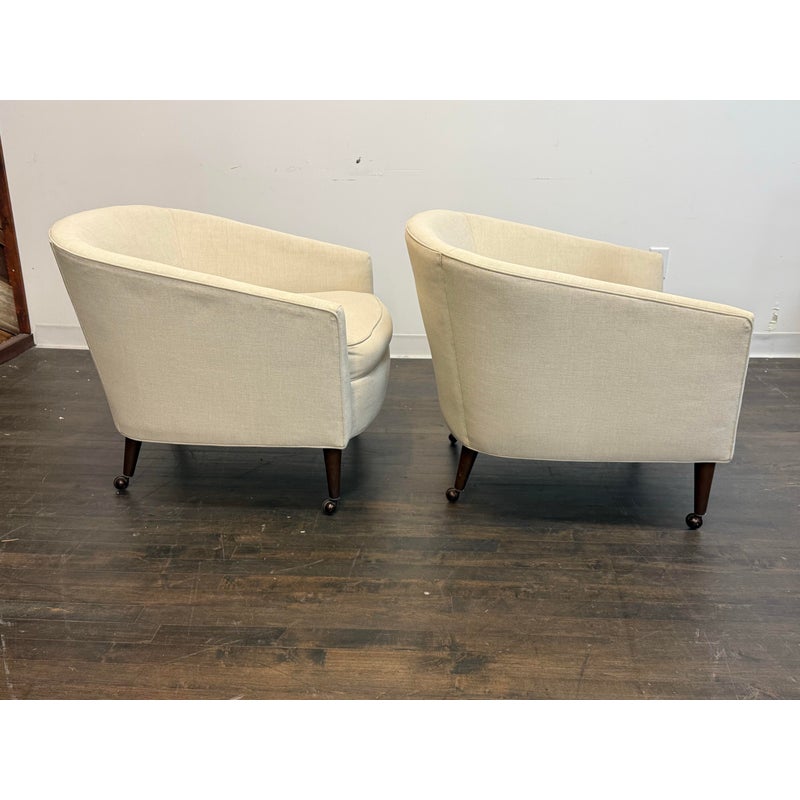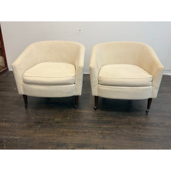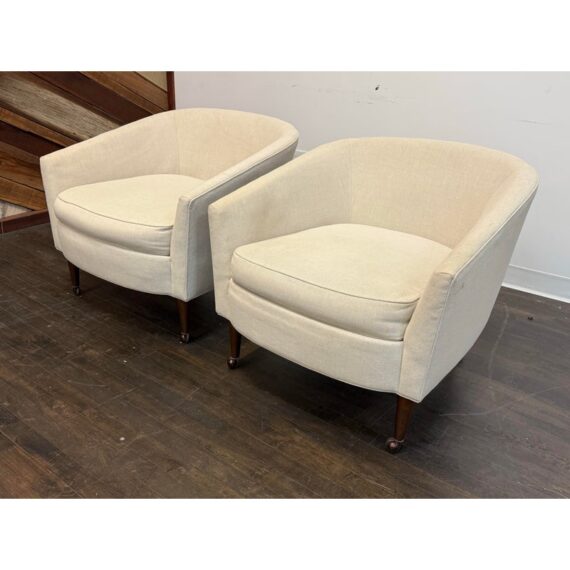 Design Plus Gallery presents a Pair of Vintage Lounge Chairs from Unknown Maker. A stylish pair of vintage barrel-back armchairs featuring a sloped frame and a comfortable low-back silhouette. Each chair is designed with a loose seat cushion and classic barrel form that offers both visual warmth and relaxed seating. Upholstered in a light ivory linen, the fabric shows visible staining and would benefit from professional cleaning or reupholstery, making these chairs an excellent candidate for restoration or customization. The chairs rest on round, tapered wood legs in a warm brown finish, fitted with casters for easy mobility. A versatile pair with timeless proportions, ideal for a living room, bedroom, or reading nook. In good vintage condition, visible wear on fabric from usage. Made in USA.