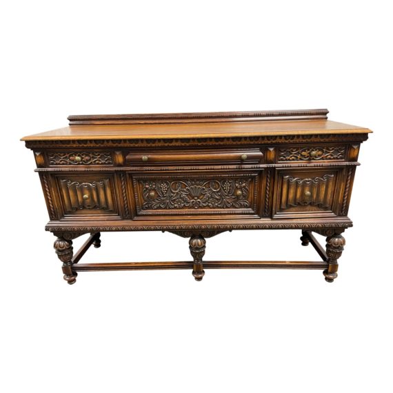 Design Plus Gallery presents a Mid 20th Century Black Forest Style Sideboard. Ornate carvings are stained a dark rich Chestnut tone similar to an antique. Baluster feet are reinforced with a trestle. An expansive dovetail drawer anchors the middle of the unit with cabinets flanking each side. Three shallow drawers line the top including one middle one with felt lining. Visible where through out, good condition. Includes original key