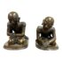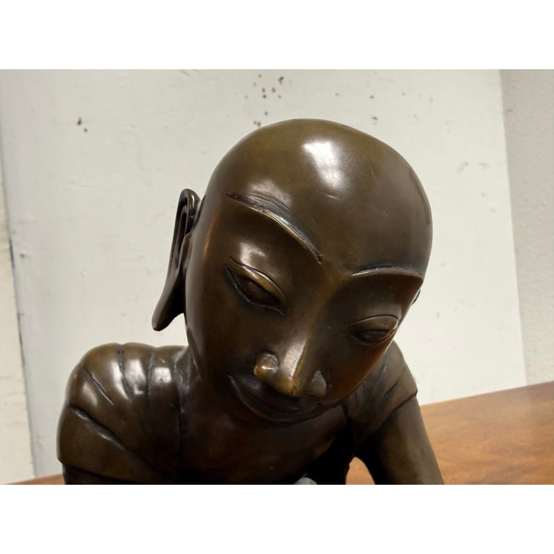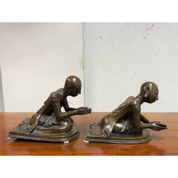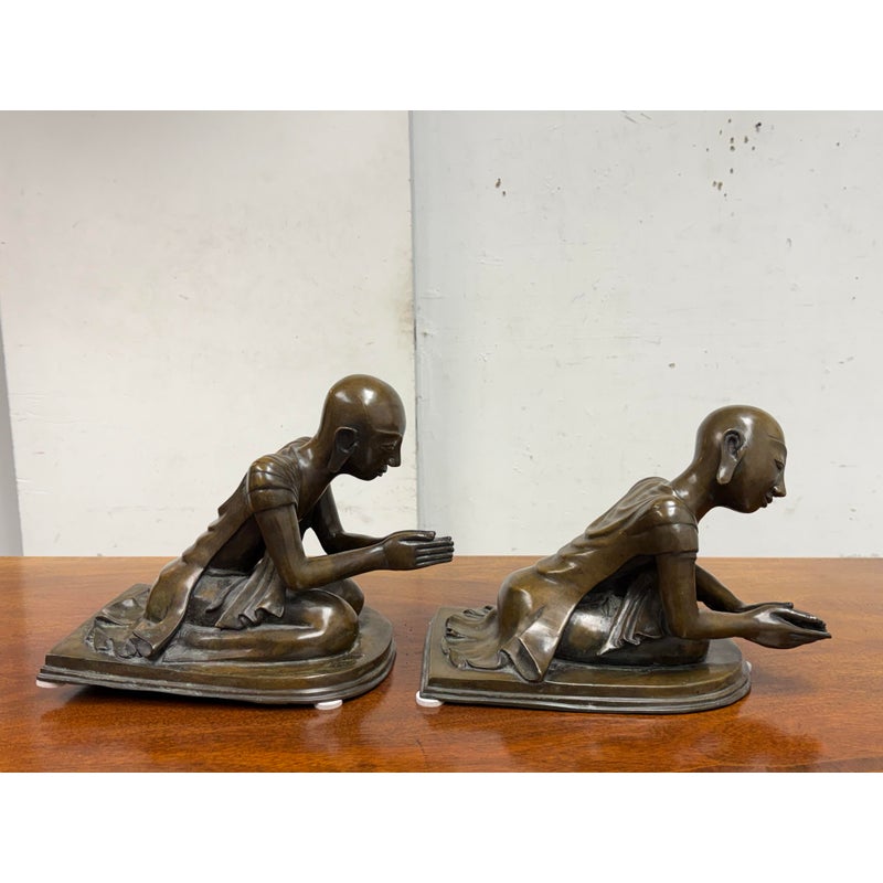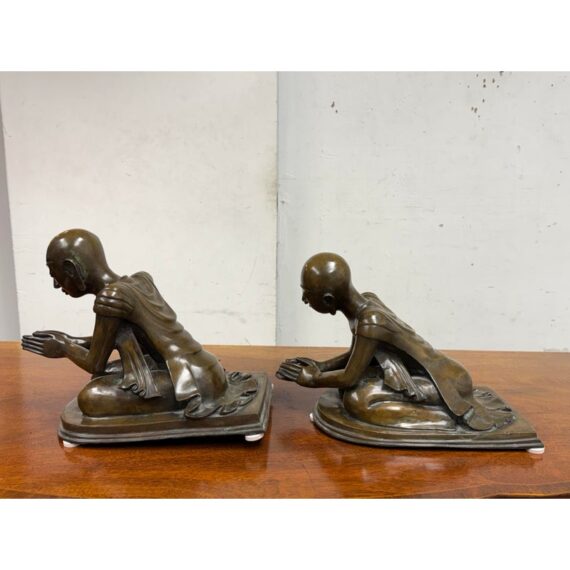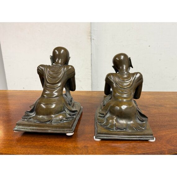 Design Plus Gallery presents a Pair of Bronze Southeast Asian Buddhist Monks. These monks are similar but not alike with their body in poised shape that are slightly unique to one another however they look as if they should stay together; as if they are in communication with each other. They are made from a deep tone of solid, real bronze and is in good condition for its usage. One sculpture has a rod underneath which doesn’t not sit flat.