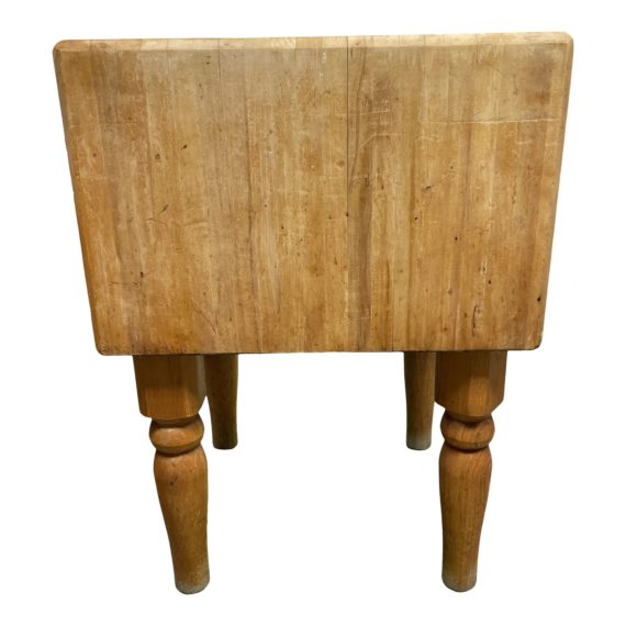 Design Plus Gallery presents a Mid 20th-Century Butcher Block. Turned solid legs support the solid jigsaw inlaid top. A rich patina from time and use add to the character and depth of the table. A soft beveled edge surrounds the perimeter. There is a noticeable crack on the side (pictured.). Charming presence can double as a side table or anchoring center point for a chef’s cone.