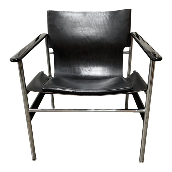 Tubular chrome frame with fused epoxy stretchers and arms. Black saddle leather sling seat has a thin leather cushion. Chair was manufactured in the early 1960’s. Visible wear through out with usage and age. Makers mark is on the bottom of the sling.