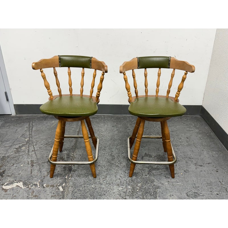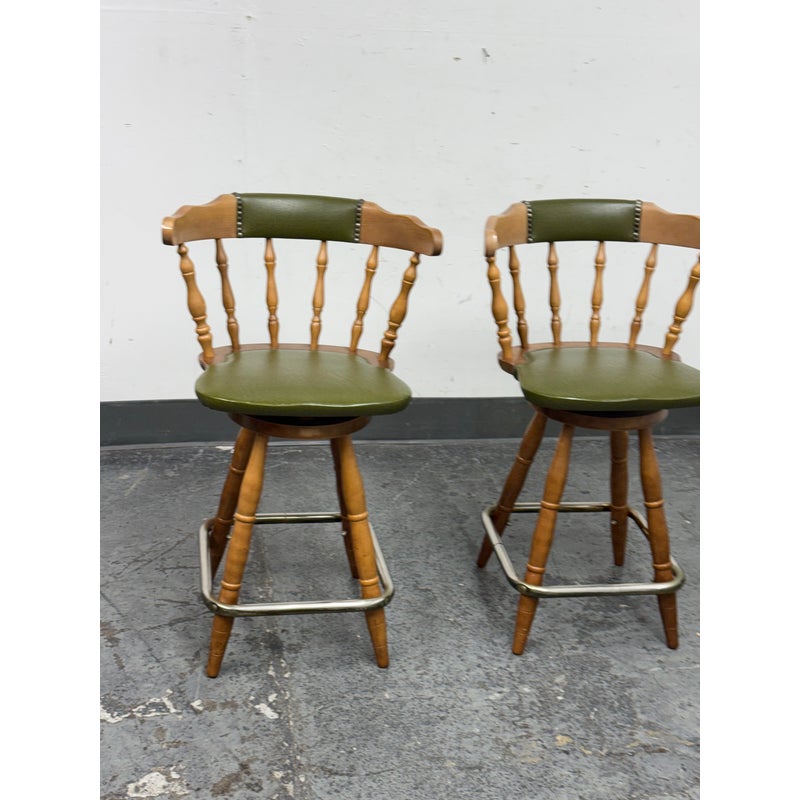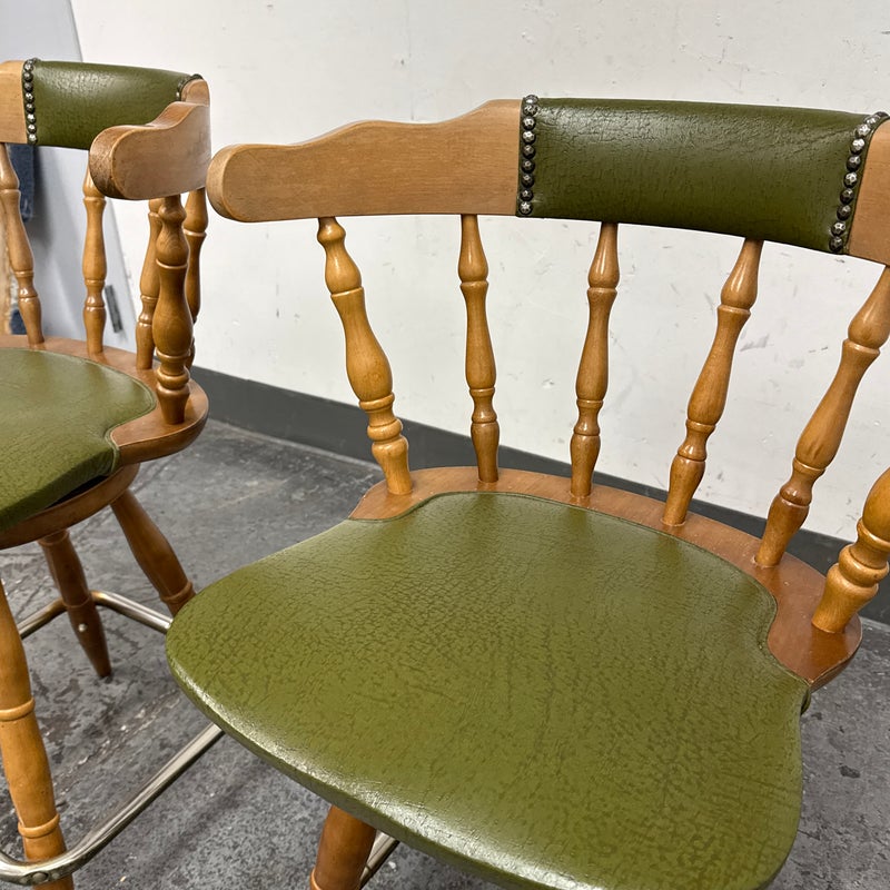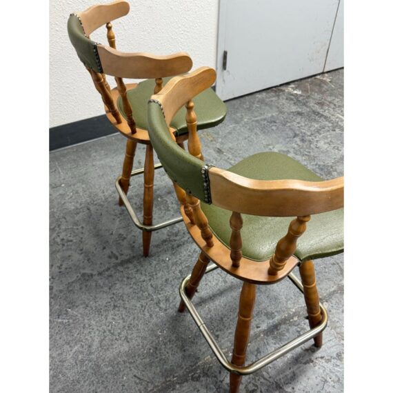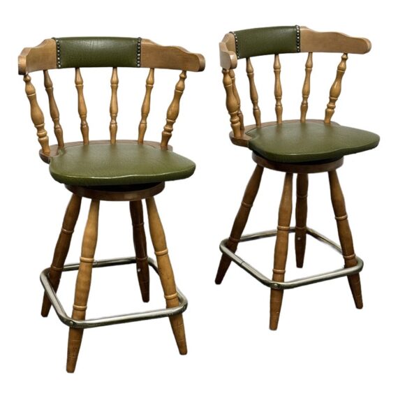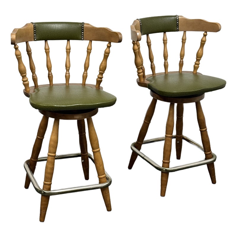 Design Plus Gallery presents a Pair of Mid Century Olive Vinyl Counter Stools with Swivel Seats. They have that 1970s feel, with the Avocado Green tones the natural jewel tone of that time. A comfortable throwback for your cabin or rustic home. Both have minimal signs of distress for their age. Made in USA.