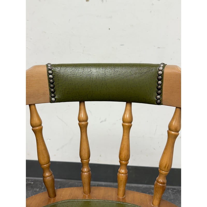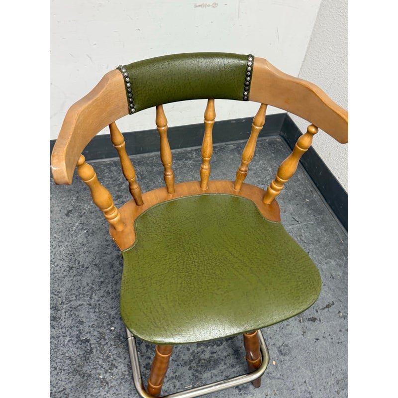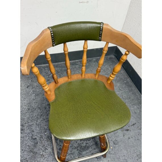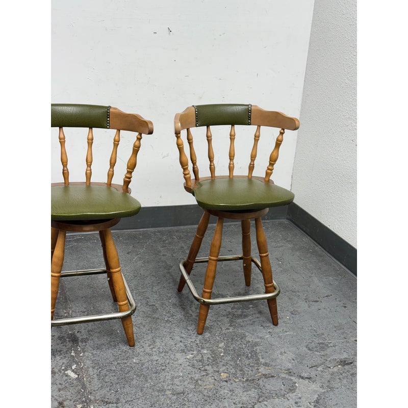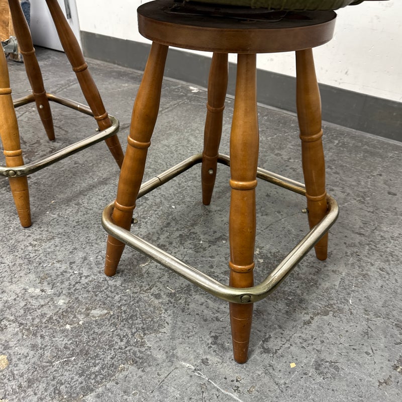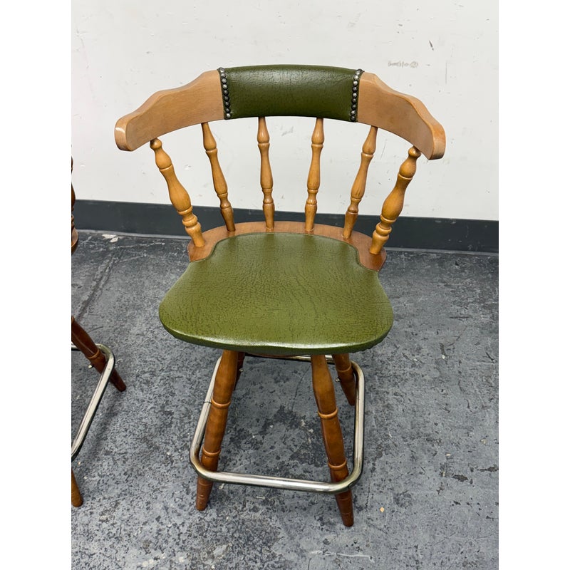 Design Plus Gallery presents a Pair of Mid Century Olive Vinyl Counter Stools with Swivel Seats. They have that 1970s feel, with the Avocado Green tones the natural jewel tone of that time. A comfortable throwback for your cabin or rustic home. Both have minimal signs of distress for their age. Made in USA.