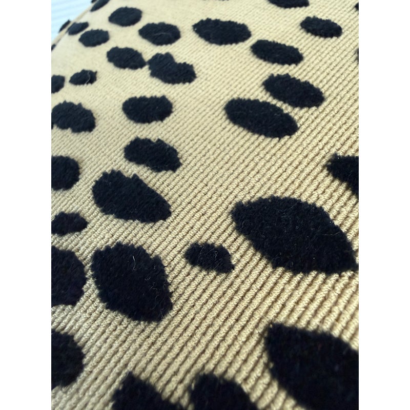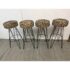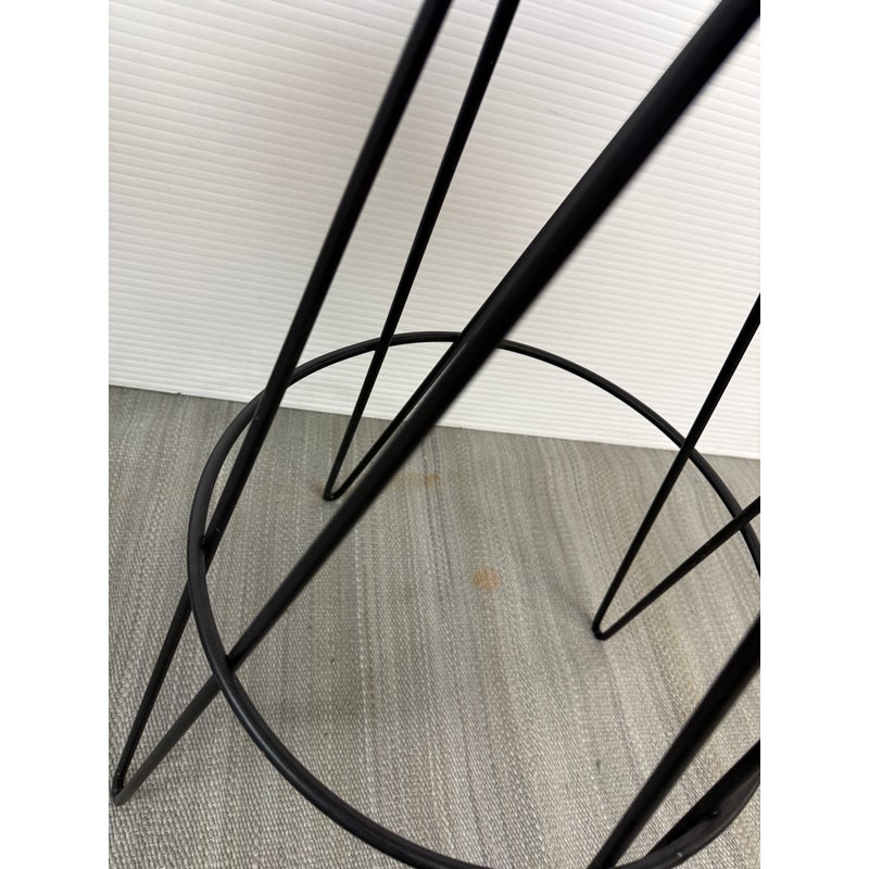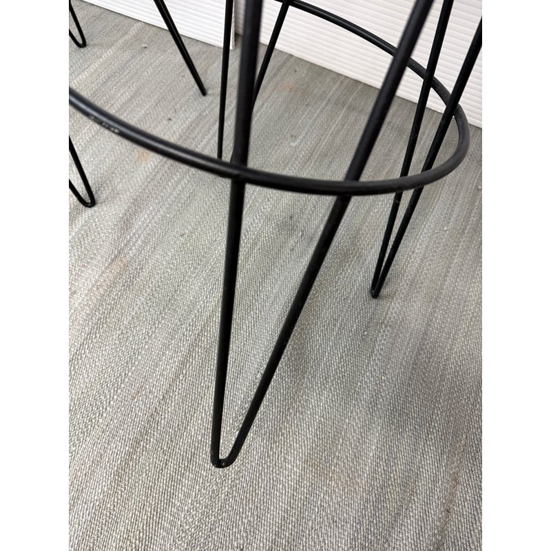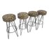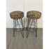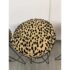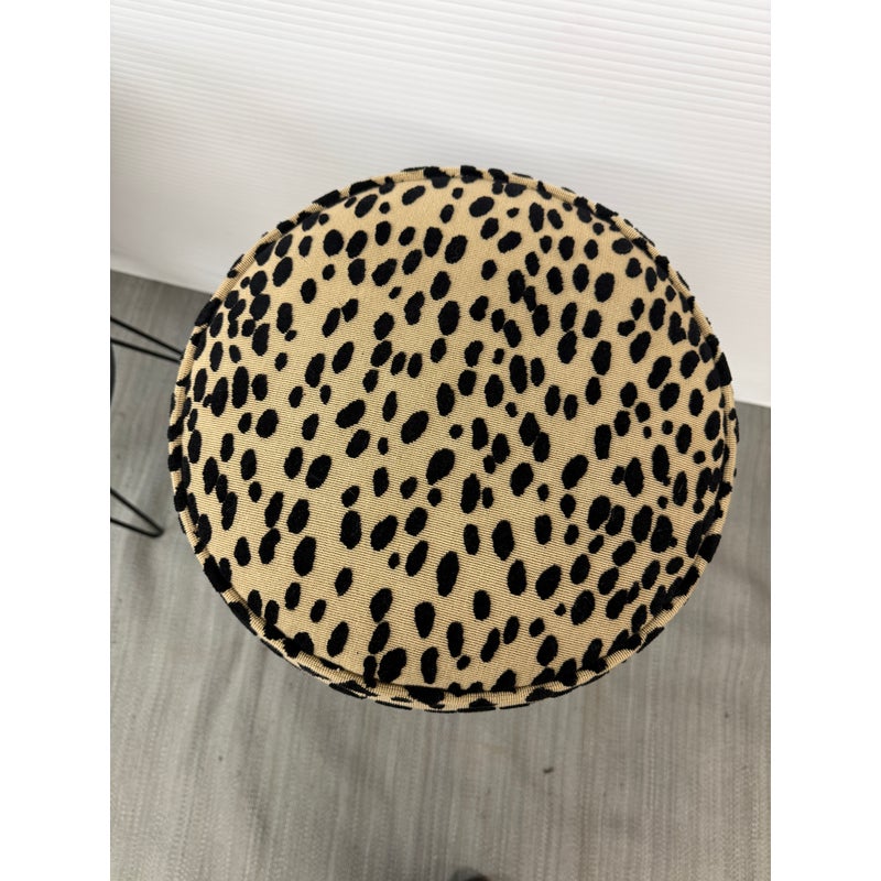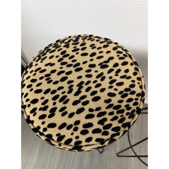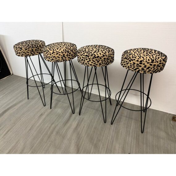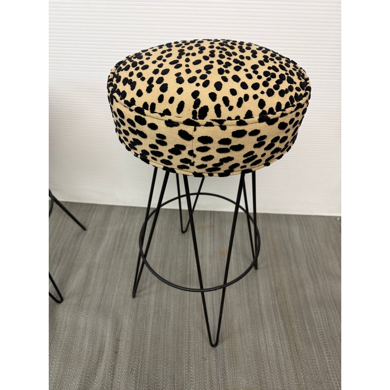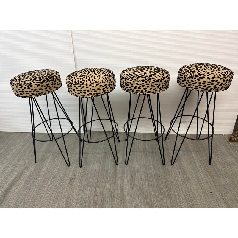 Design Plus Gallery presents a Set of Bar Stools from the Mid 20th Century. They have metal frames that are black with an undulating piece of steel that creates four legs and a singular round that goes around the frame forming a kickstand. The padded seat was recently reupholstered in a cheetah print fabric of beige with raised black cheetah spots. The stools are all in good condition for their usage with minimal wear.