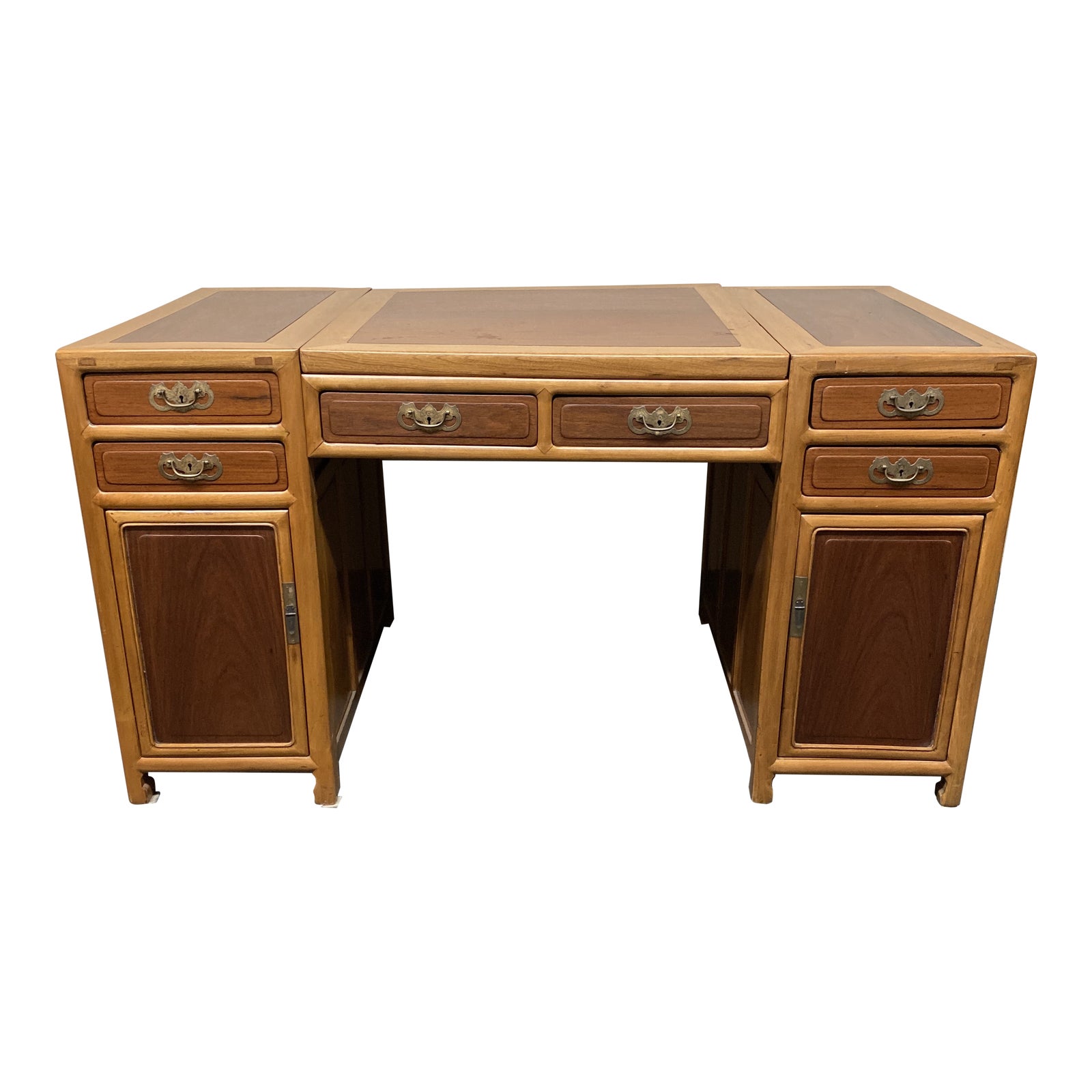 Design Plus Gallery presents an Antique Chinese Desk. Easily assembled from a few components, this beautiful two-toned desk is light and easy to move. Six shallow drawers and two large cubbies to fill with necessities for working from home. A pair of footed panels work for interior space or as foot rests. An inspiring work place.