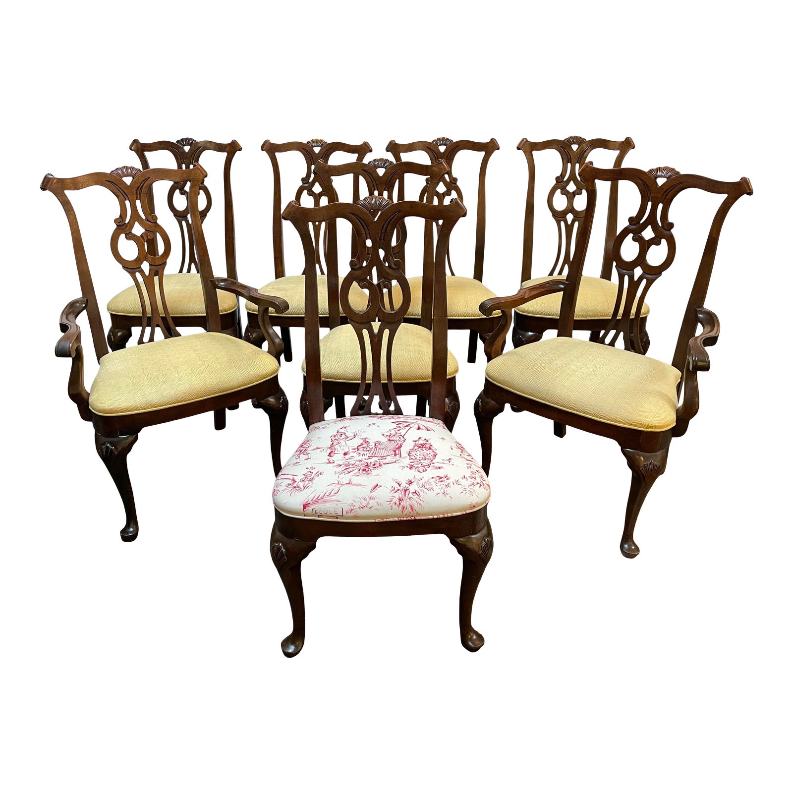 Design Plus Gallery presents a Mid 20th Century Set of Eight Chippendale style Dining Chairs. Formal and delicate at the same time, the open back solid wood chairs create an elegant dining setting. Carved and curved frames and neutral upholstery, except for the one side chair upholstered in red on white toile, the seats work with many styles of tables. One arm chair has sun damage.
