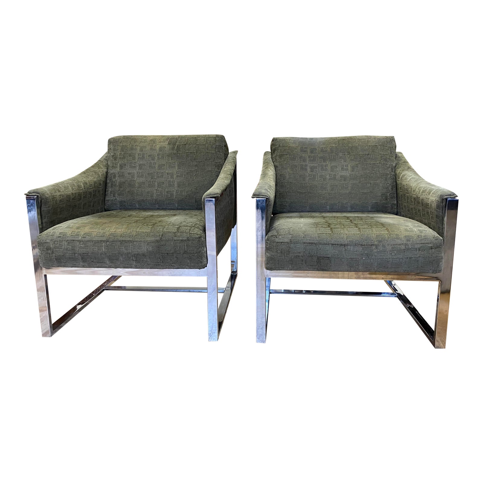 Design Plus Gallery presents a Pair of Mid 20th Century Arm Chairs. A chrome plated metal frame with minor patina. Upholstered in an olive green geometric fabric. Visible and minor wear.