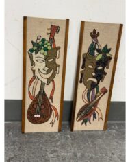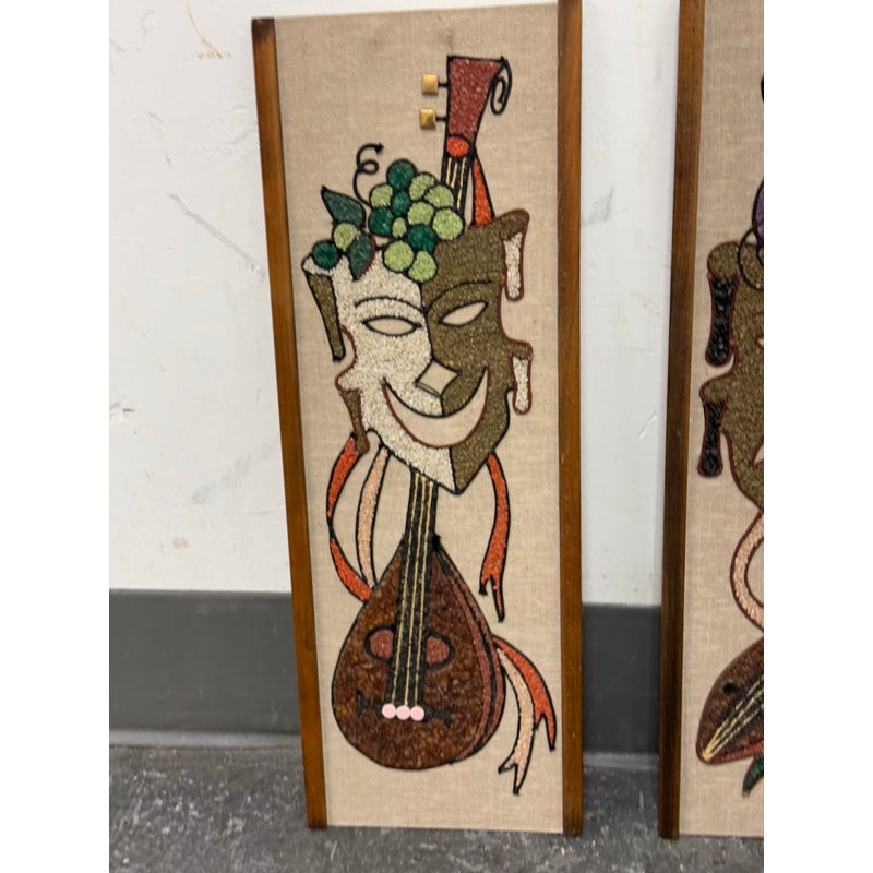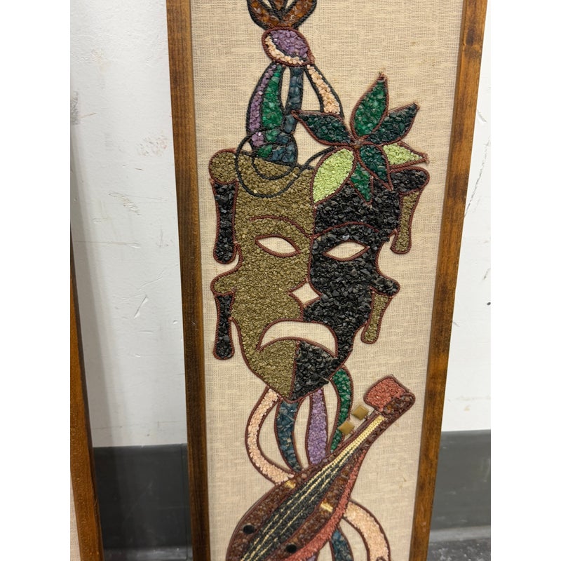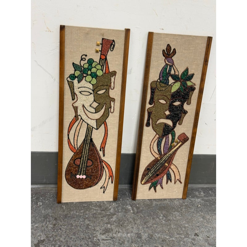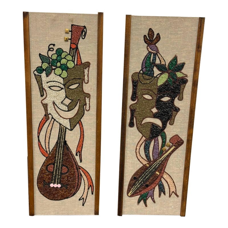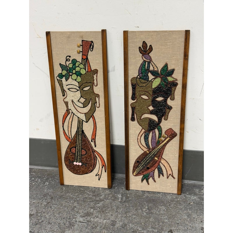 Design Plus Gallery presents a Pair of Comedy & Tragedy Made of Pebbles from the Mid 20th Century. They represent the comedy of life. The two makes are both in white backgrounds with their face smiling in gold and white, frowning in black and gold. They both have instruments. They are in good condition for their usage.