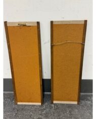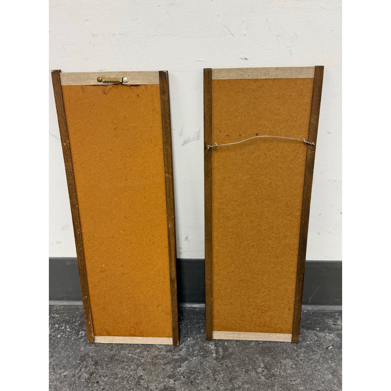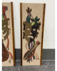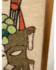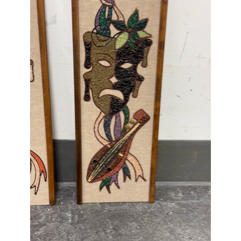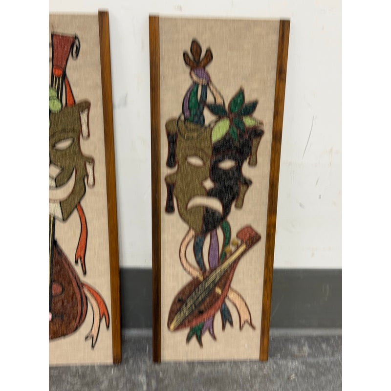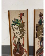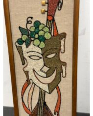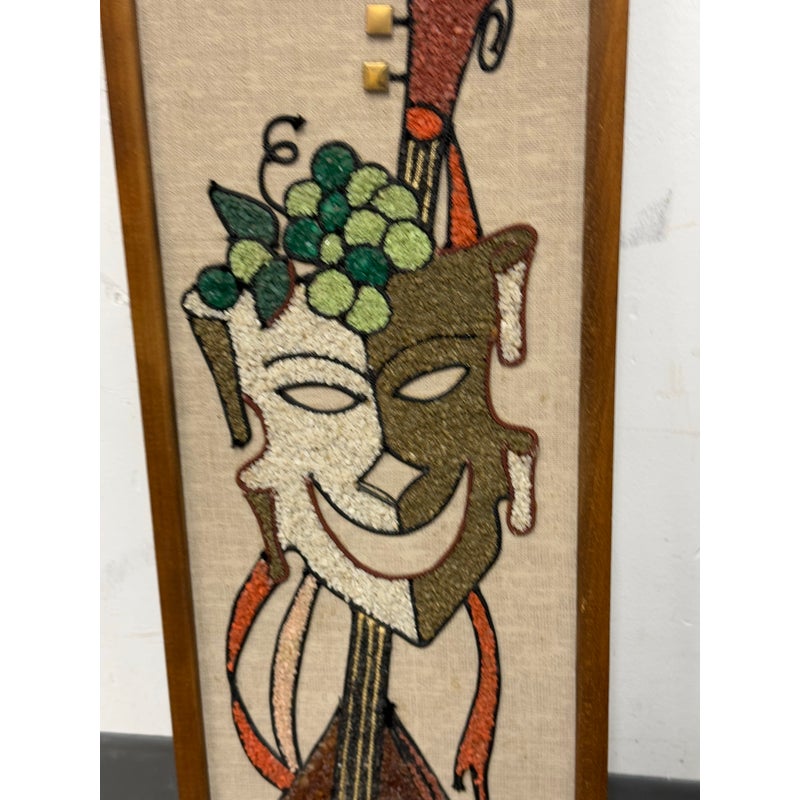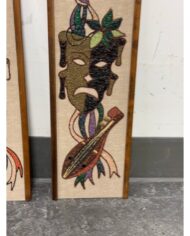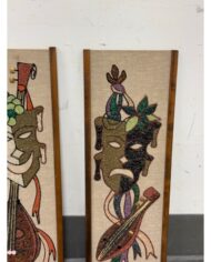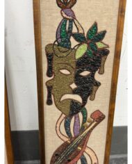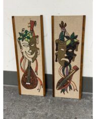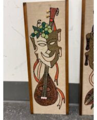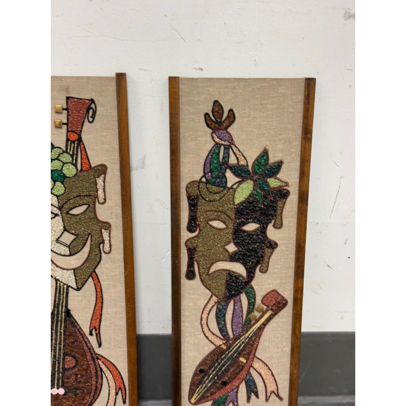Design Plus Gallery presents a Pair of Comedy & Tragedy Made of Pebbles from the Mid 20th Century. They represent the comedy of life. The two makes are both in white backgrounds with their face smiling in gold and white, frowning in black and gold. They both have instruments. They are in good condition for their usage.