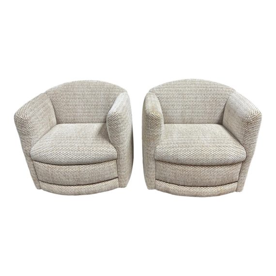 Design Plus Gallery presents a Pair of Mid 20th Century Curved Bulbous Lounge Club Chairs. The pair of mid 20th century curved bulbous lounge club chairs are a stunning addition to any space. Upholstered in a luxurious A. Summer Textile Chenille fabric, these chairs are not only visually appealing but also incredibly comfortable. The cream/ecru field color of the fabric is complemented by vermillion, gold, camel, and cocoa warp weaves, creating a rich and elegant look. The firm attached seating of these chairs ensures that they provide a comfortable lounging experience. The barrel backs offer additional support and enhance the overall aesthetic of the chairs. The front banding of the chairs is accented with head to head nail trimming, adding a touch of sophistication and uniqueness to the design. These chairs are versatile and can be adapted to various seating arrangements. They can be placed in a living room or den, creating a cozy and stylish seating area. Additionally, they can be used as gaming chairs, providing comfort and support for long hours of gameplay. In a home theater, these chairs can serve as luxurious seating, enhancing the overall viewing experience. They can also be used as guest chairs in a guest bedroom, providing both comfort and aesthetic appeal to visitors. These are from Serra Design of California. Visible and minor wear.