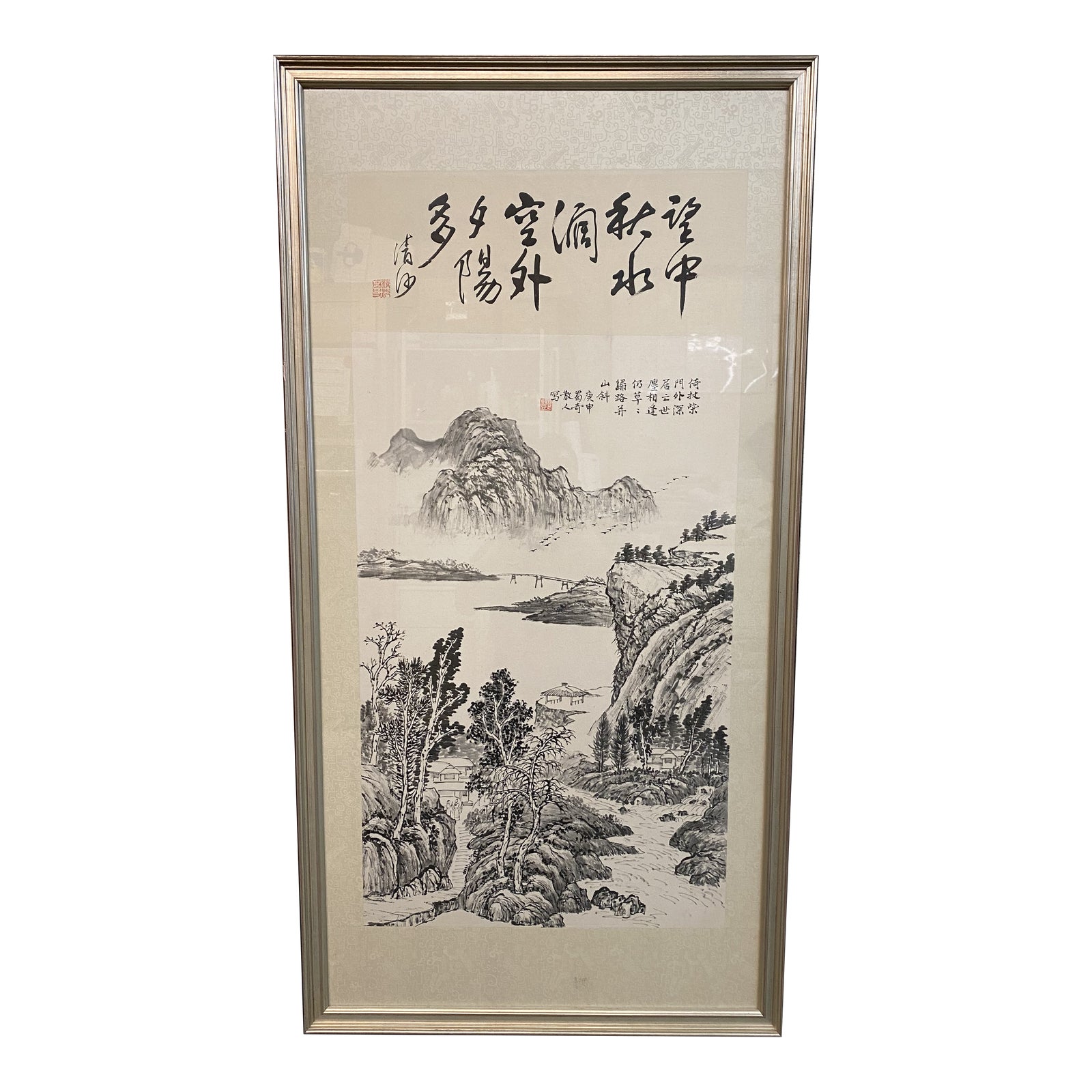 Design Plus Gallery presents a Vintage Asian Landscape on Silk. Silk matted and silver painted framing is a subtle display for the black ink on silk mountain and valley scenery depicted. Signed print.