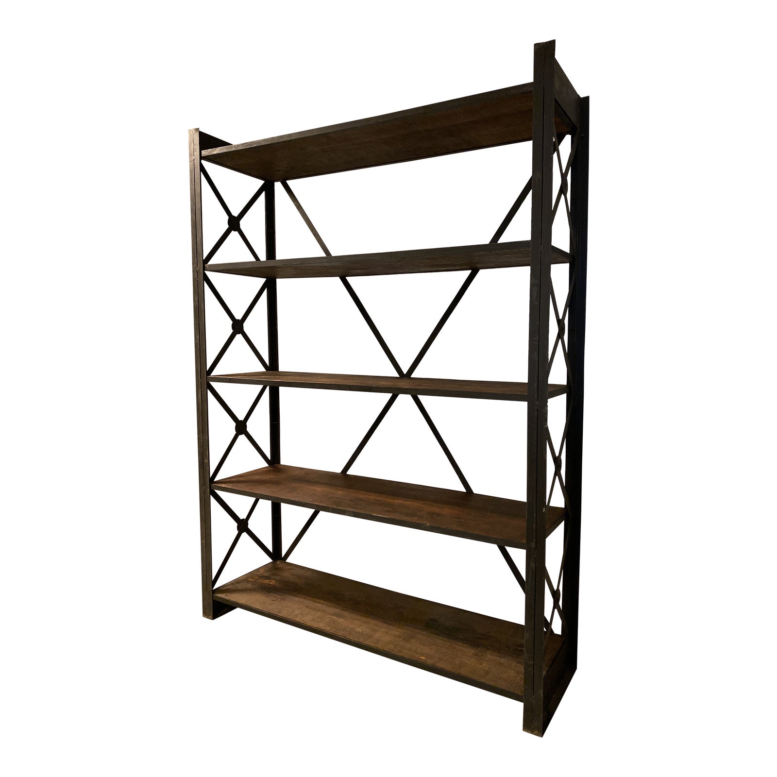 Design Plus Gallery presents an Iron + Wood Industrial Shelf. Originally purchased from Big Daddies Antiques in Las Angeles. The top and base shelf are fixed, three shelvings are adjustable in height. A true industrial piece for your space. Iron frames with wood inserts. The piece is heavy and sturdy. Can be dissembled and lay flat for easy transportation.