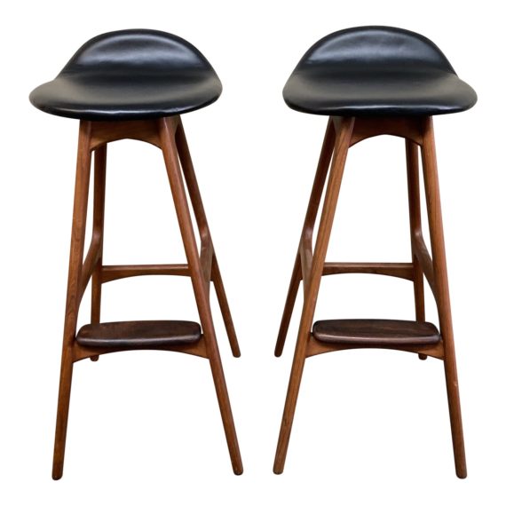 Design Plus Gallery presents a Pair of O.D. Mobler for Domus Danica modern teak and leather bar stools. A Mid-Century silhouette, the pair have a shaped top upholstered in black leather. Simple teak base with box stretcher supports and rosewood foot rest.