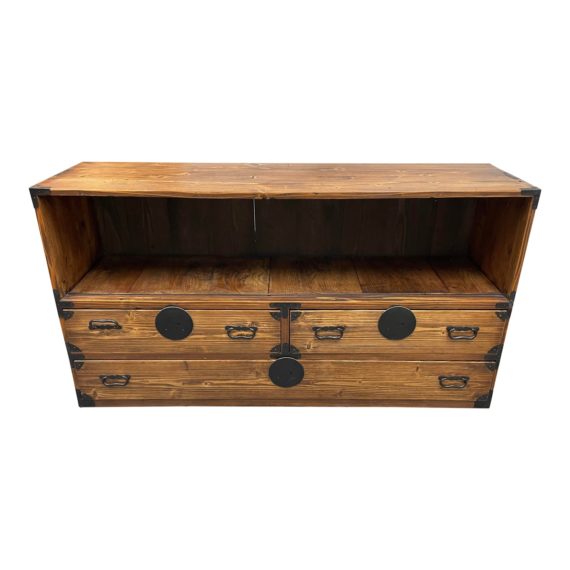 Design Plus Gallery presents a Mid 20th Century Elm Tansu Sideboard. Three large and expansive drawers anchor the base with a generous opening on top. for displaying and storing every day items. Oiled brass hardware adorns the sides with handles and pulls on the drawers. Elm has been slightly stained to bring out the grain. Minor wear, good condition.