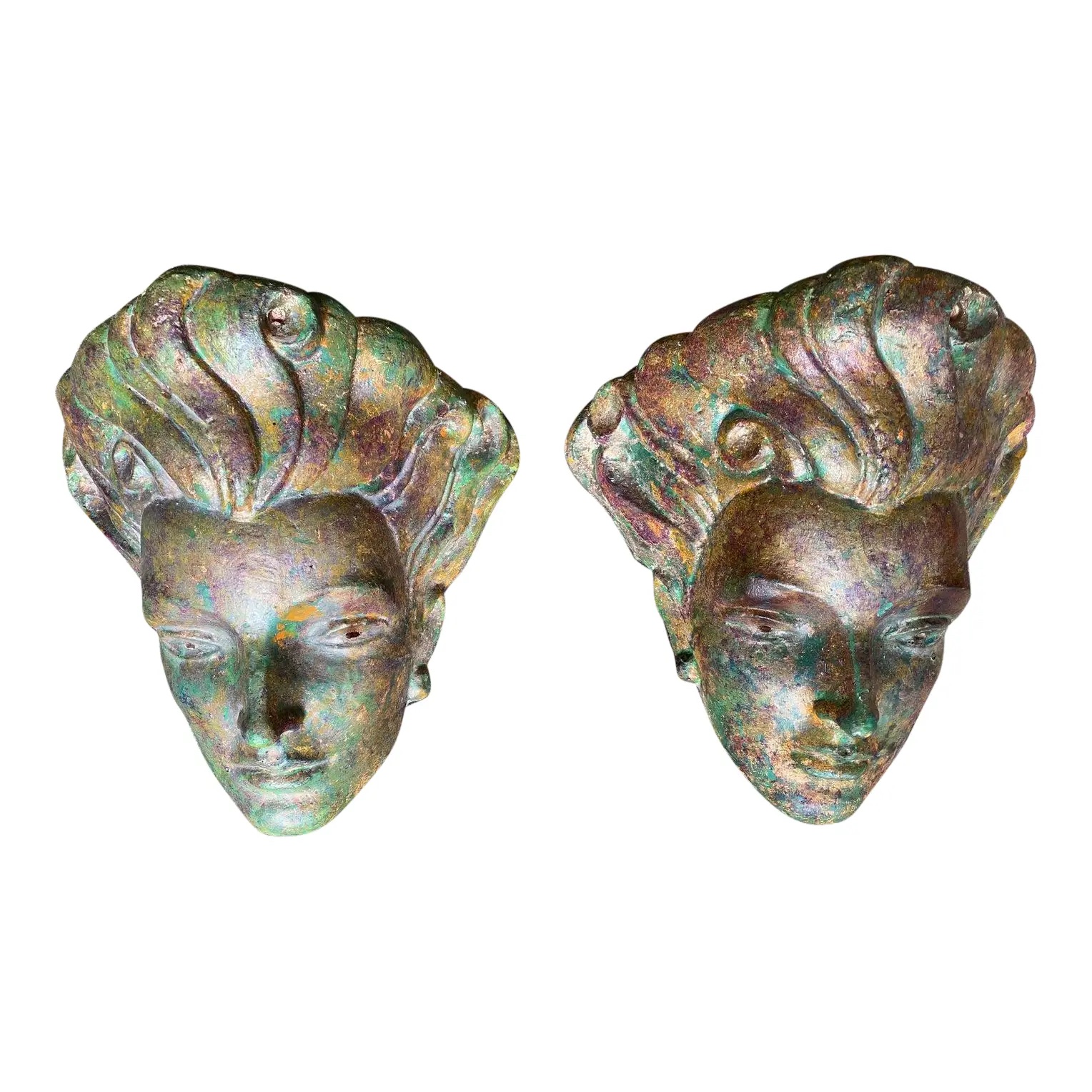 Design Plus Gallery presents a pair of Mid 20th Century Female Deco Wall Sconces. Made from plaster the elegant profiles bounce lighting up from their cloud like hair and through their pupils. Plaster shows a rich patina from previous iterations from restaurants to residences. Truly unique and one of a kind. Visible wear due to age. Sconces require hard wiring and come with a metal wire on back (pictured.)