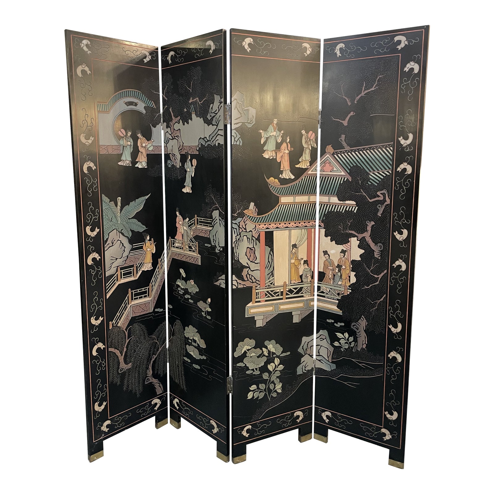 Design Plus presents a Vintage Coromandel Screen. Four panels of black lacquer with intricately carved reliefs, a village vignette on one side and flora/fauna on the reverse. Simple brass detailing on the feet compliment the range of color against the dark background. Beautiful as an art piece, functional as screen or room divider.