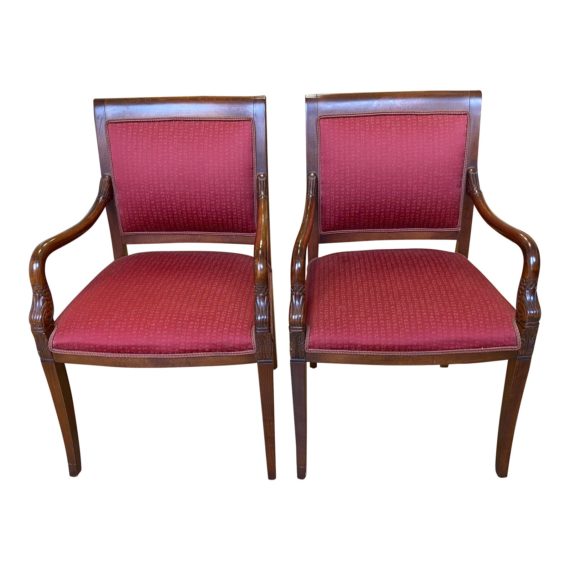 Design Plus Gallery presents a pair of Mid 20th-Century French Empire Swan Arm Chairs. Mahogany solid wood is stained and finished with satin coat to preserve the French inspired carved details in the arms. The frame is simplified with contemporary lines and supports an upholstered back and seat which have been updated in a burgundy Japanese patterned fabric. Fabric is finished with a double welt. Minor wear on surfaces. Ideal for occasional seating, captain’s chairs, or accent seating.