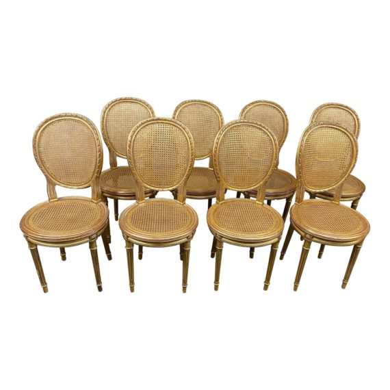 Mid 20th Century Gilt + Caned Dining Room Chairs, Set of Eight