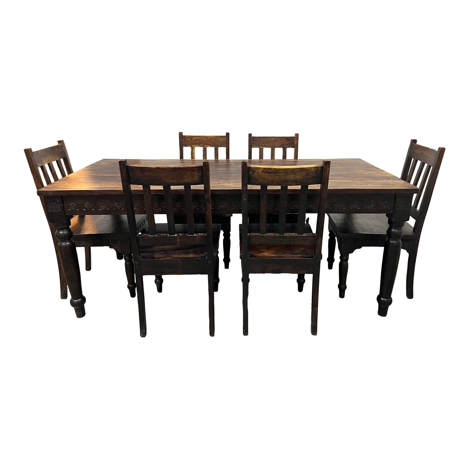Design Plus Gallery presents a Mid 20th Century Gothic Mahogany Dining Room Table + Six Chairs. This set is all hand carved with old world touches throughout. Flowers encircled the edging of each side of the table. Accented by gorgeous spindle legs on the front two legs of the chairs and also all the legs on the table.