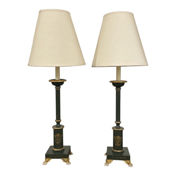 Design Plus Gallery presents a pair of Mid 20th-Century Green + Gold Footed Pillar Table Lamps. Brass clawfeet support the pedestal base and contrast the forest green beautifully. Horns, a harp and sun motifs are hand painted to create a coat of arms on the face of each lamp. Candle wax covers support candelabra bulbs. One support cover has a cracking condition. Conical rice paper + linen shades have hardware which attaches to each bulb for a small footprint. Minor wear on surfaces.