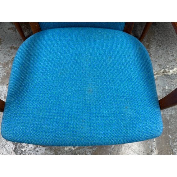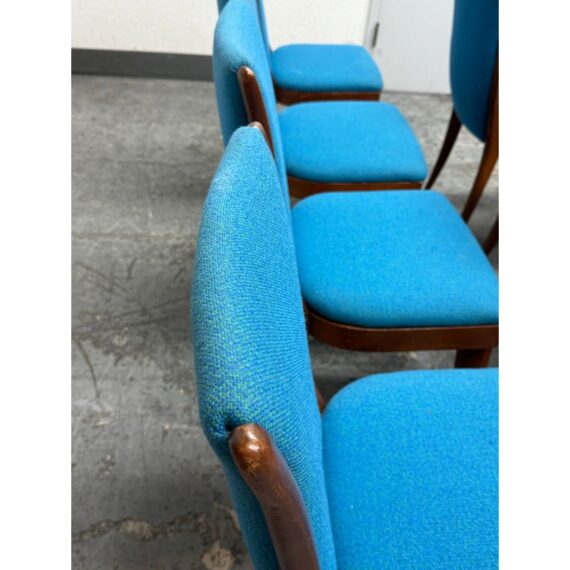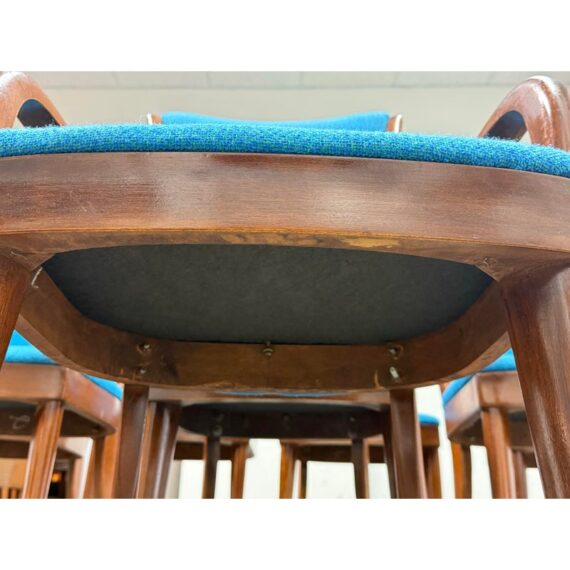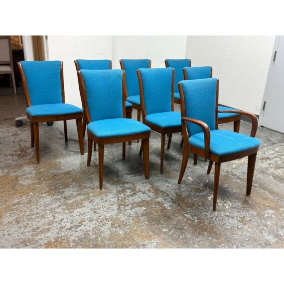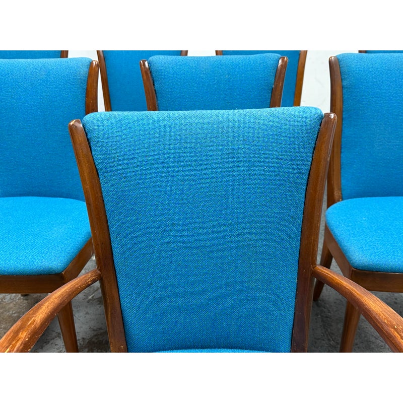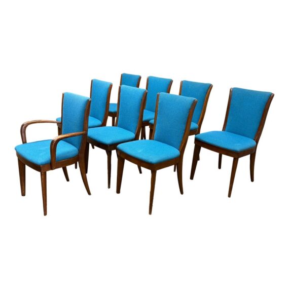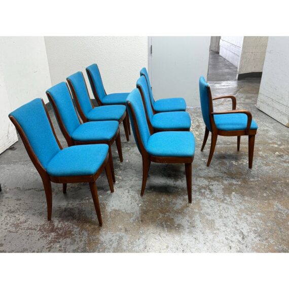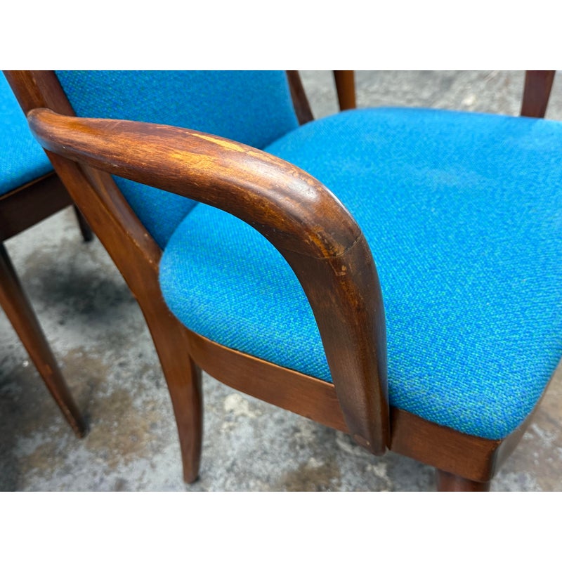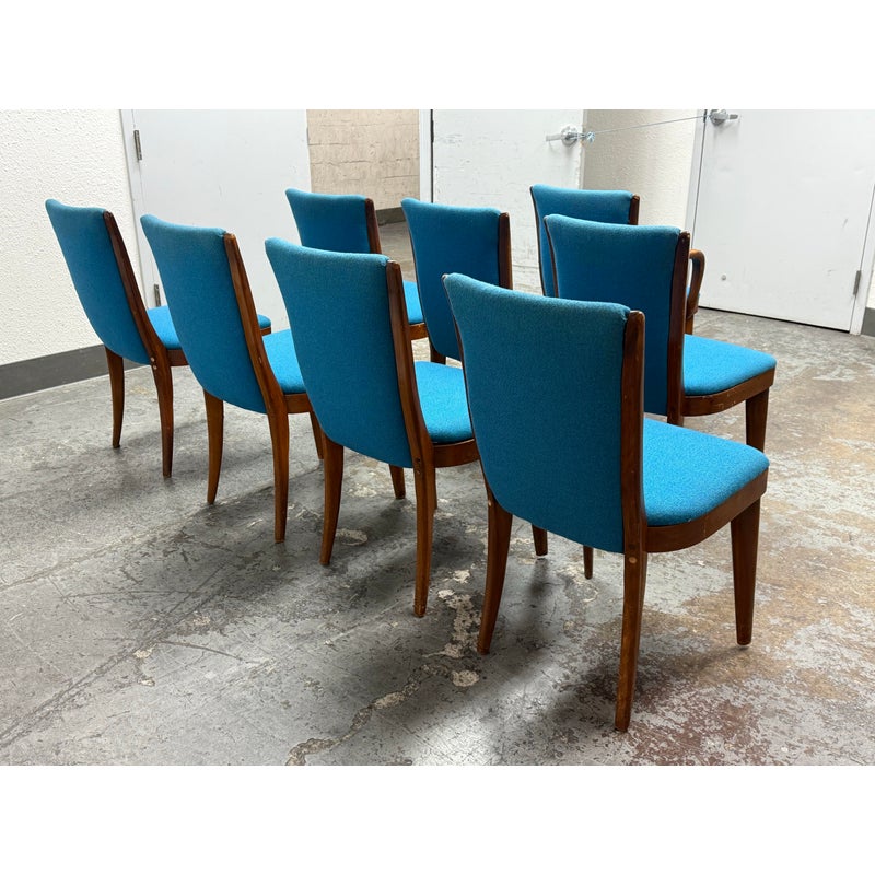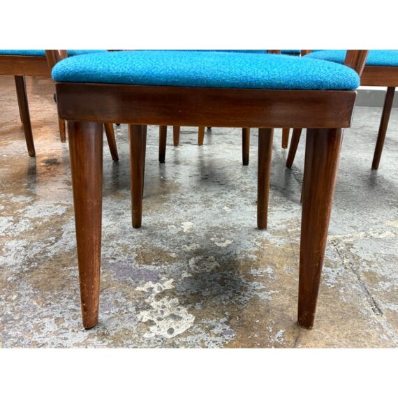 Design Plus Gallery presents a Set of Eight Teal Dining Chairs from Heywood Wakefield. The set of chairs are set into a solid walnut frames with a honey brown finish very on par for their Mid Century age + style. The material chosen for upholstery is a sweet spot in design; slightly bold but always appealing to the eye. It is slightly texturized with a nubby hand feel. Effortlessly stylish, the set has seven side chairs and a single head of table chair with arms. Brand stamp from Heywood Wakefield is found on each one. Overall, the vintage set of chairs are in good condition with visible wear to the fabric + frame. Made in the USA.