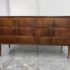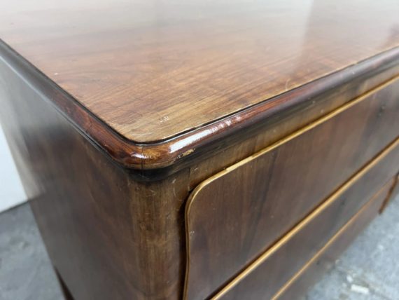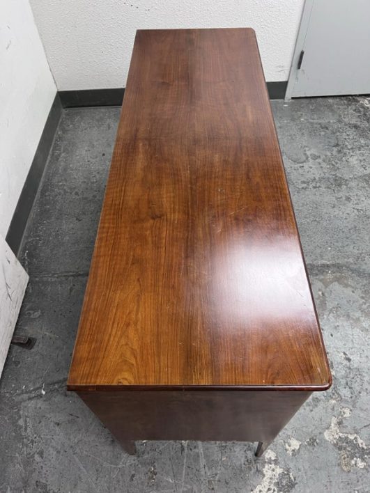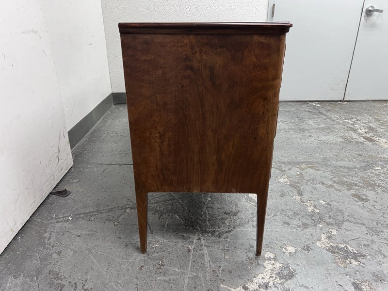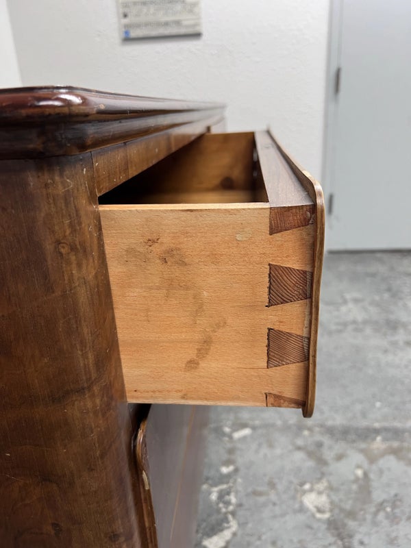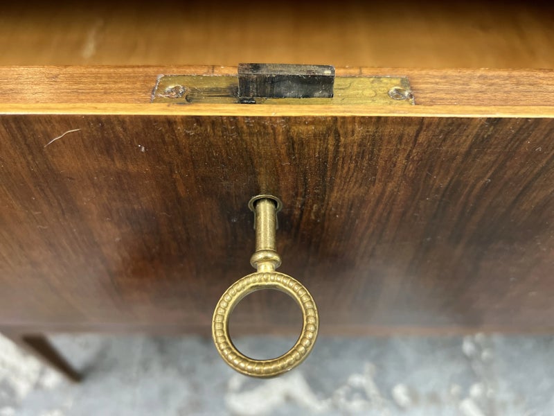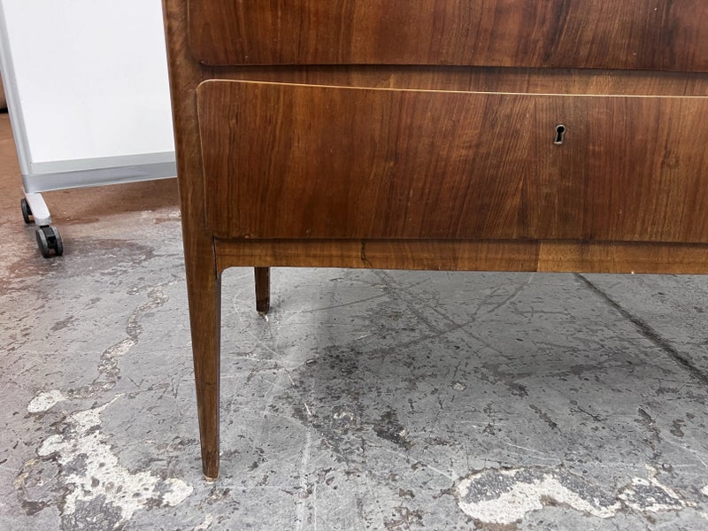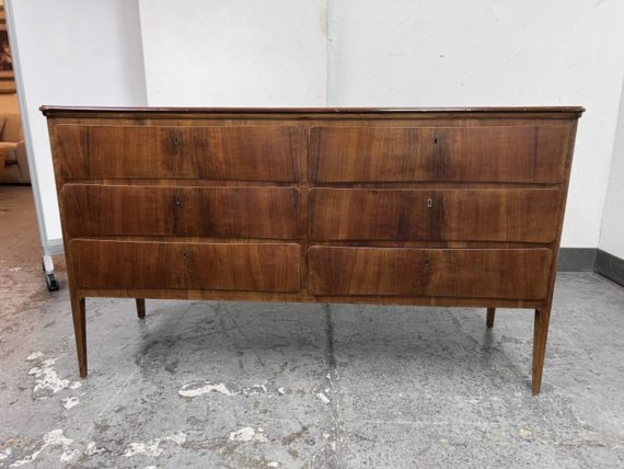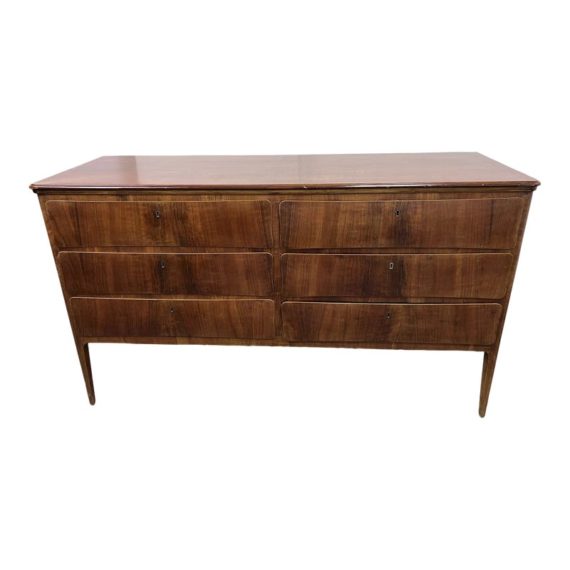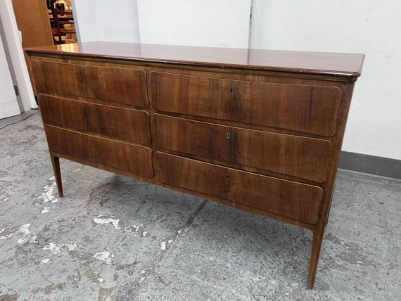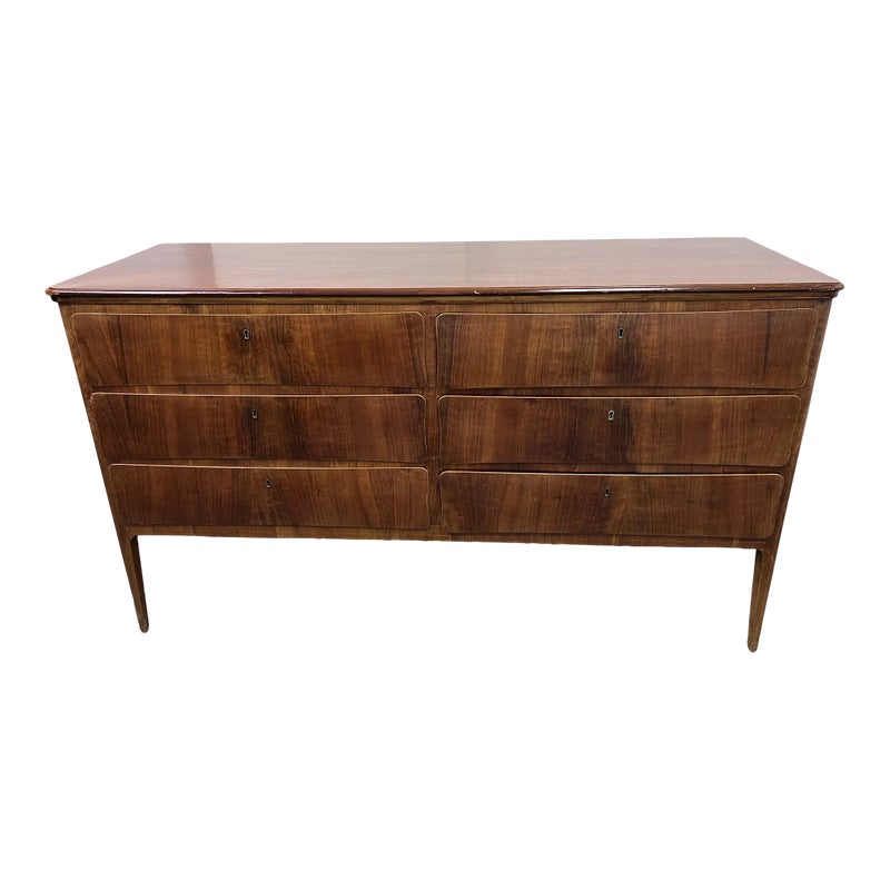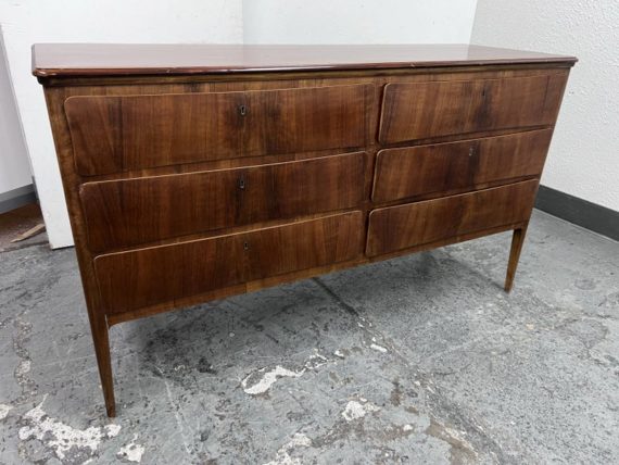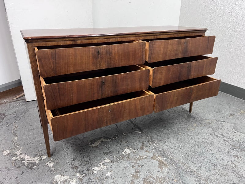 Design Plus Gallery presents a Mid Century Style Dresser with Six Locking Drawers from Italy. The charm of this piece is in its simplicity with lovely detail work that express its fine quality and craftsmanship. The drawers are all of equal size and offer a locking key for each drawer. For its age and use the dresser is considered to be in good condition for its age + use. Original 2 keys is included.