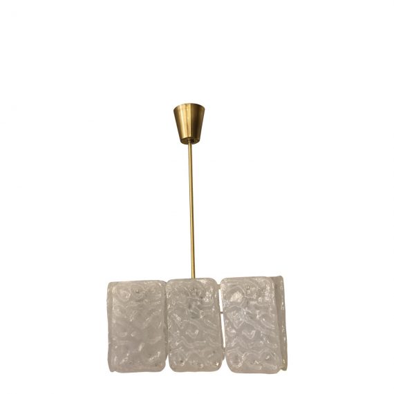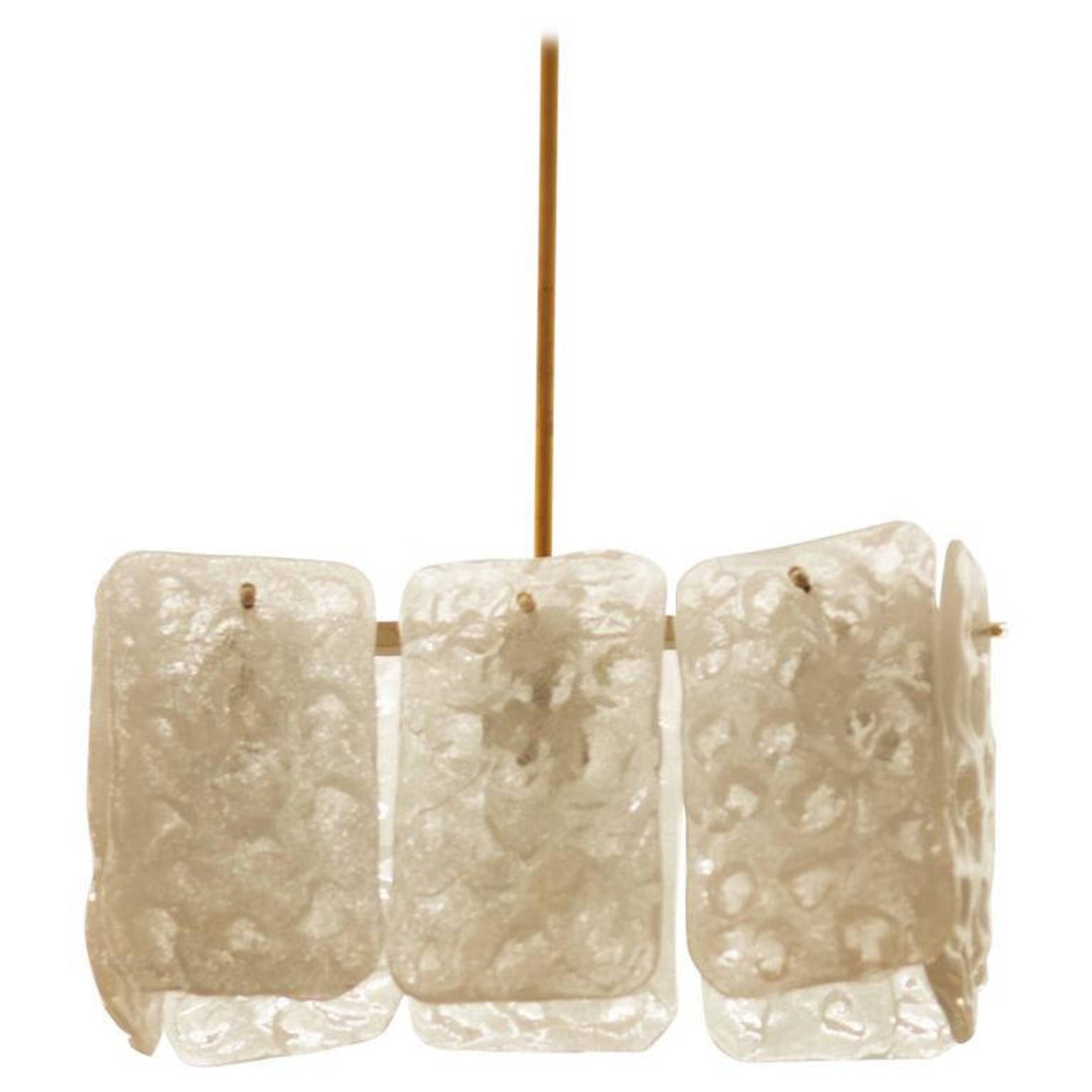 Design Plus Gallery presents a 1960’s Ice Glass Chandelier by JT Kalmar. A brass brush finish steel frame with eight textured frosted hanging glass panels. Features three light sockets. Made in Austria.