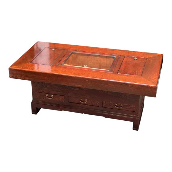 Design Plus Gallery presents a Vintage Japanese Hibachi Table. The table is handcrafted in wood with wood and inset with three beautiful folded copper-lined boxes. The top’s center vessel has a glass lid, the outer lids are wood. Three shallow drawers store accoutrements on each side. All handles are brass and original. Raised base is carved and beveled. Visible minor wear consistent with age + use; good condition.