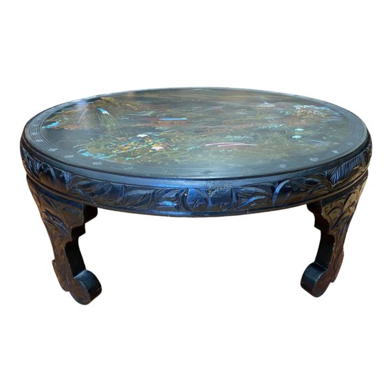 Mid 20th Century Japanese Mother of Pearl Hand Painted + Carved Round Coffee Table