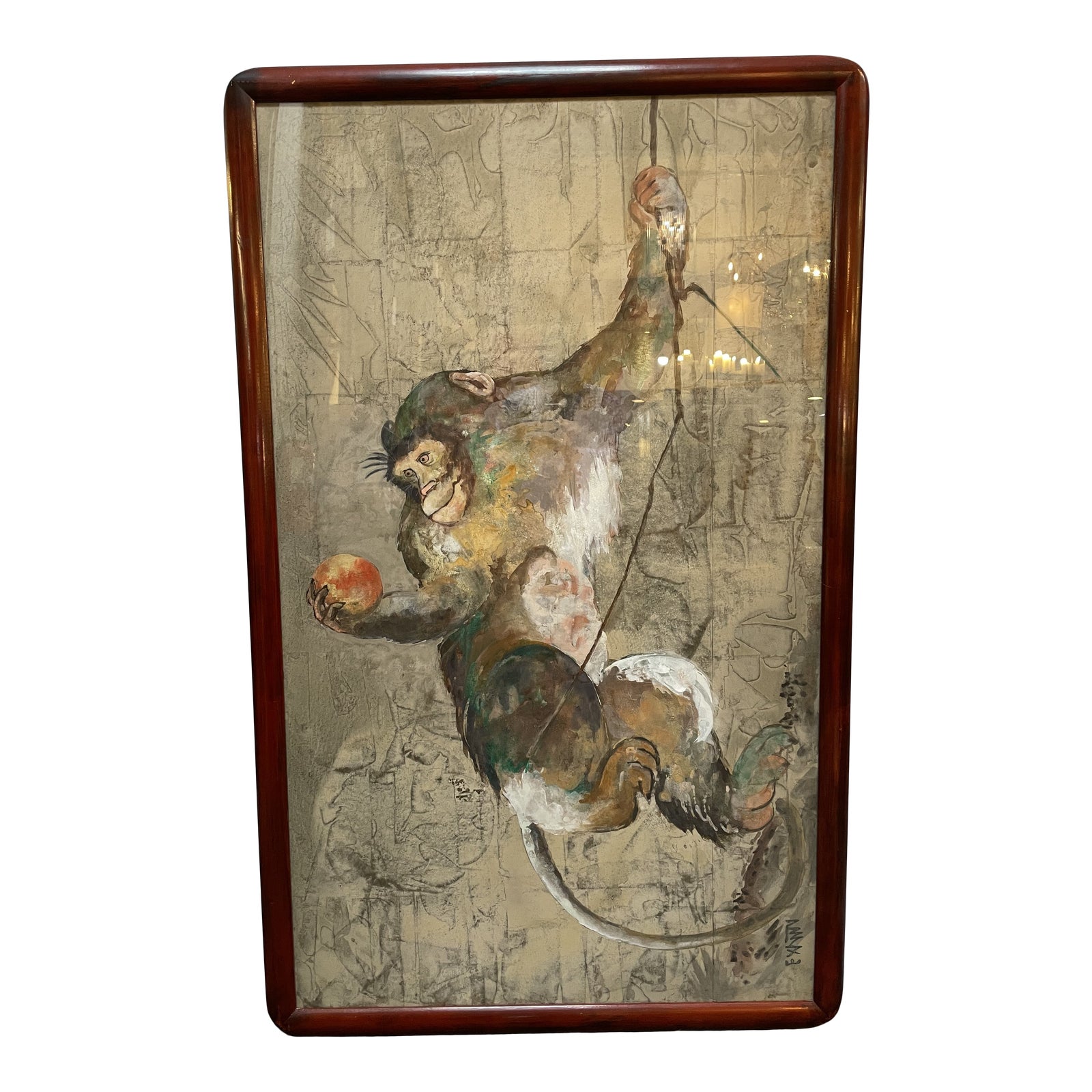 Design Plus gallery presents a Mid 20th Century Large Scale Original Monkey Watercolor Painting. Signed by the artist in the lower right corner. Beautifully framed in a deeply stained burgundy with variation for an antiqued look. Paper has been treated with a weathered and textural cream application. Monkey is beautifully rendered with an array of colors in this moody yet vibrant palette. Minor wear, good condition.