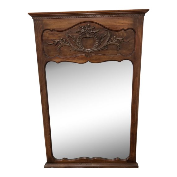 Design Plus Gallery presents a Mid Century Logan Porter Mirror Co. 305 Provincial Classic Hanging Mirror by Davis Cabinet Company. This mirror is from 1949. Traditional Mid Century style. Carved Walnut with elegant curves and splendid details. Good condition, minor wear from age.