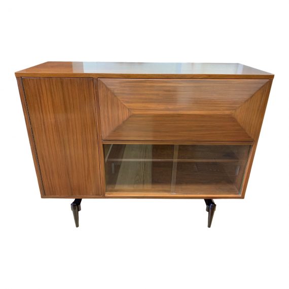 Design Plus Gallery presents a Mid-20th Century Mahogany Drop Front Bar Cabinet. To compete that cool mid-century decor, this fine quality dry bar with hinged drop-front opening to reveal a lighted and mirrored interior fitted fitted with caddies for glassware. Above sliding doors with a hinged door on the left for additional barware and bottles. Raised on a ebonized wood base.