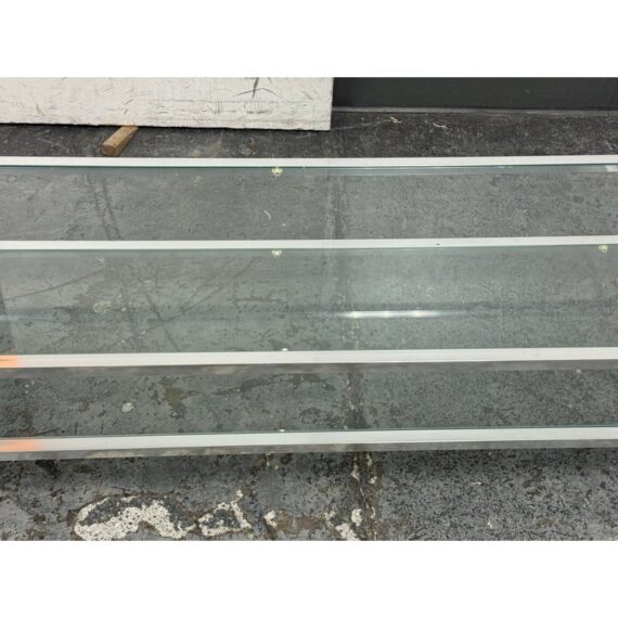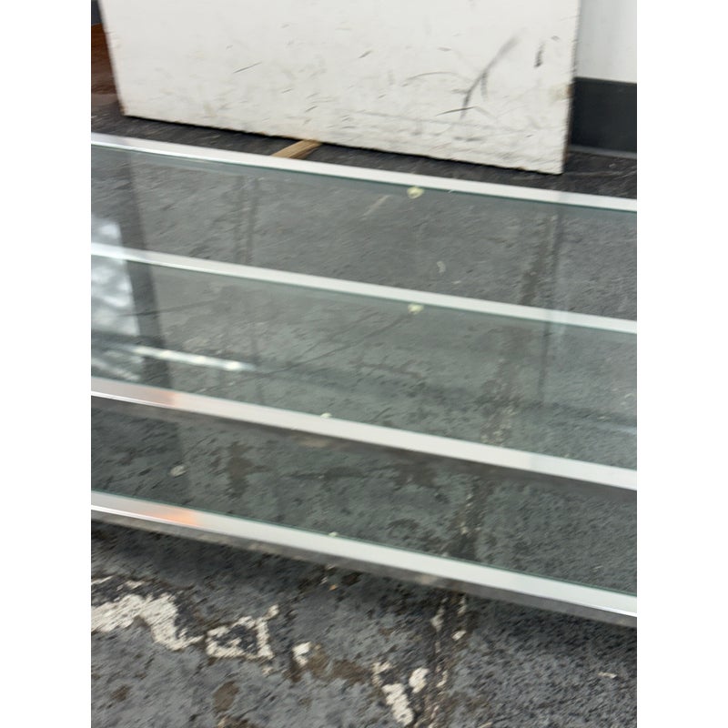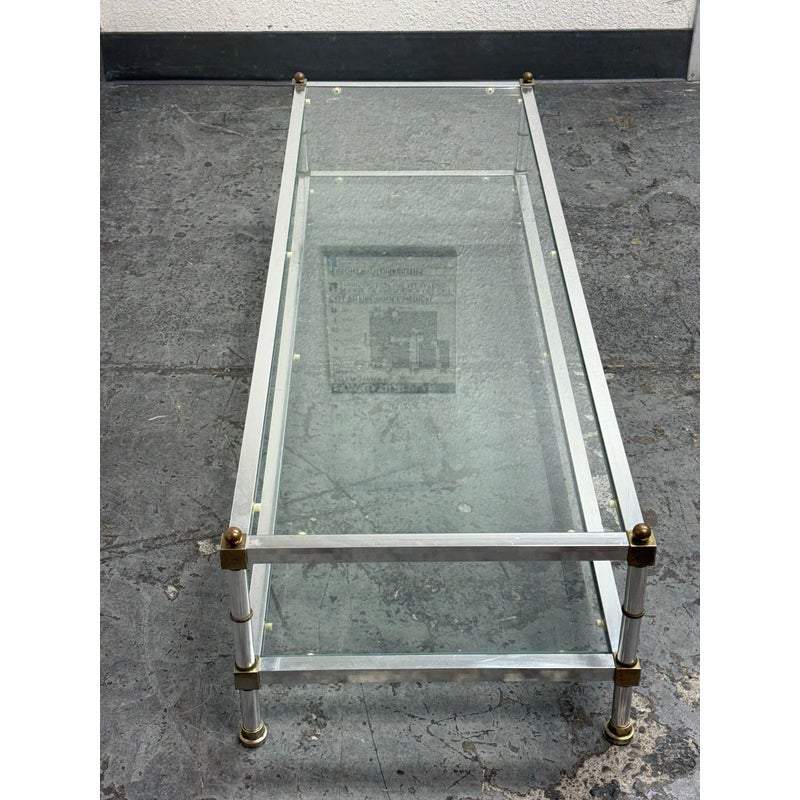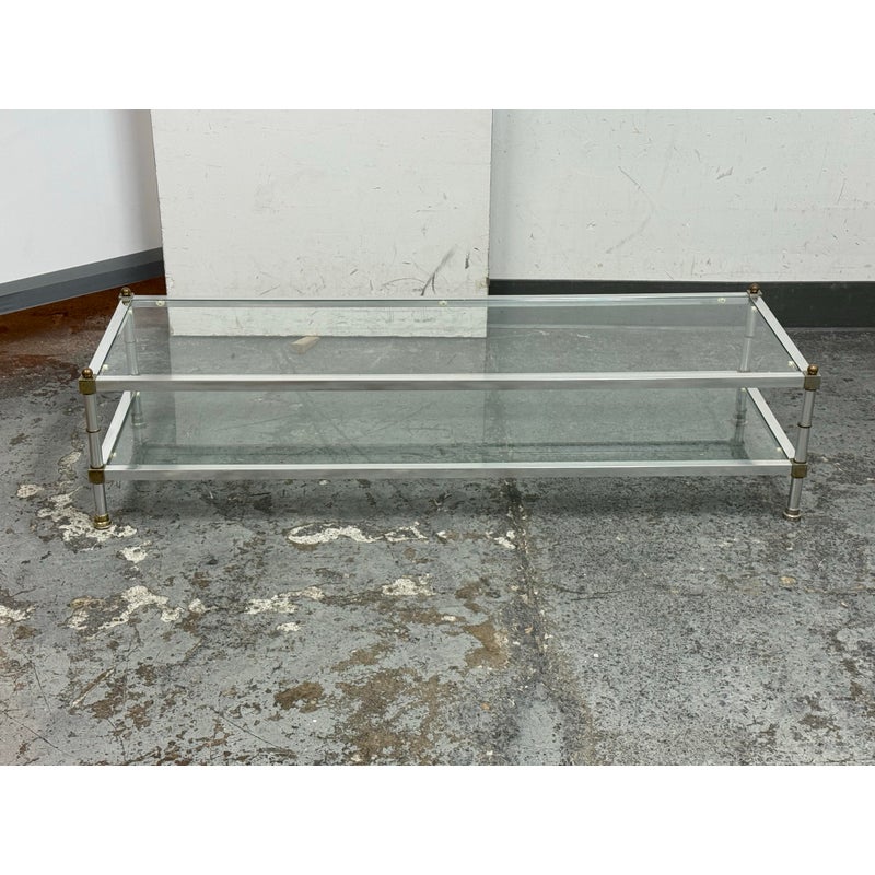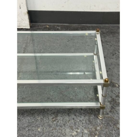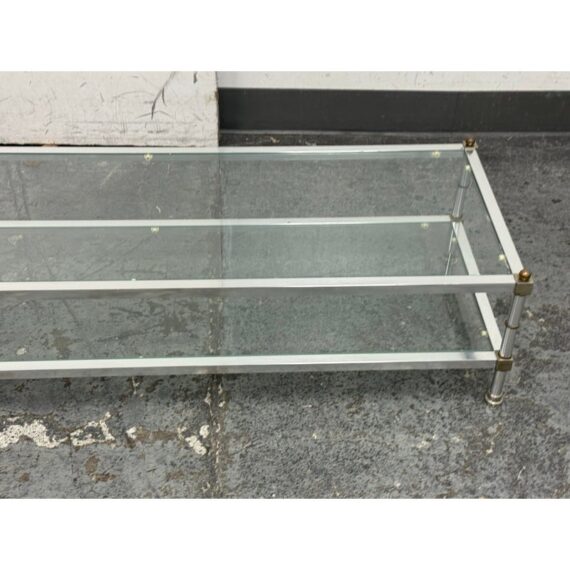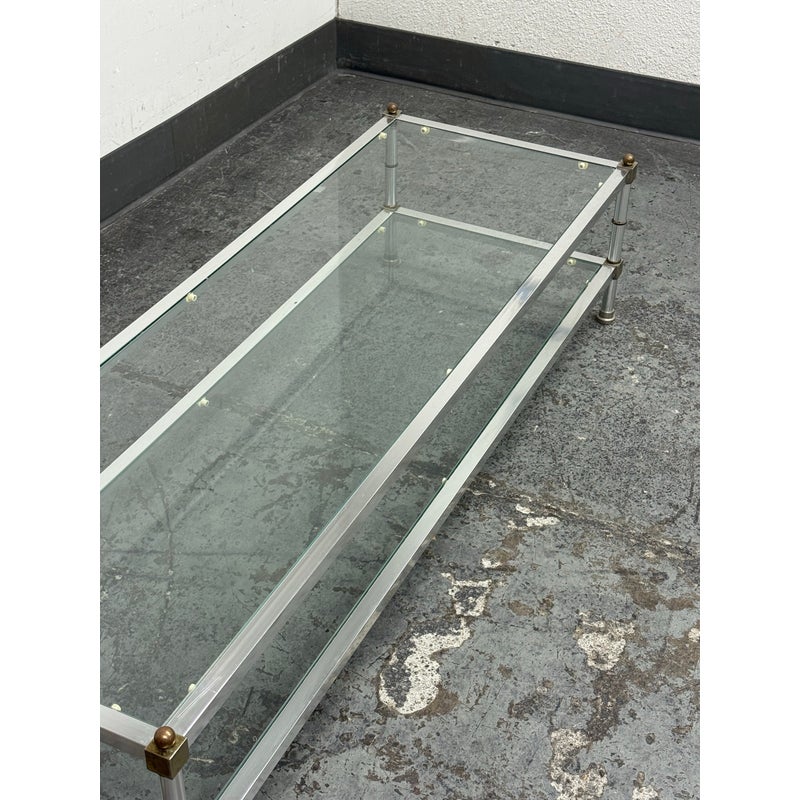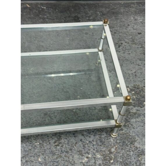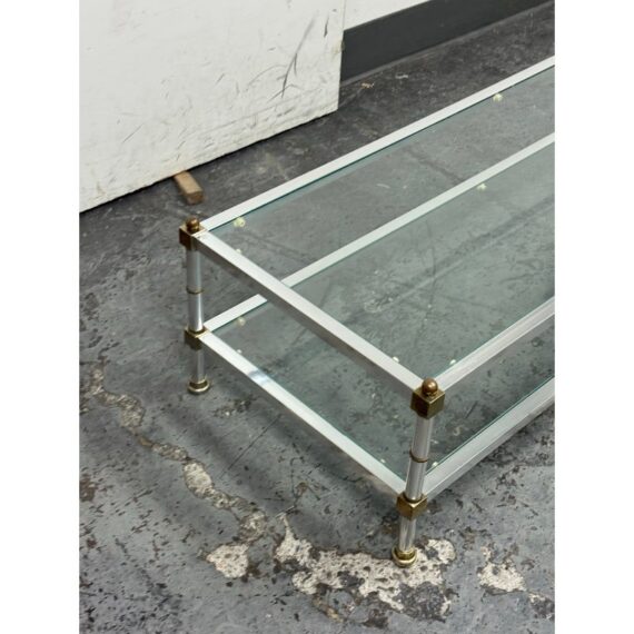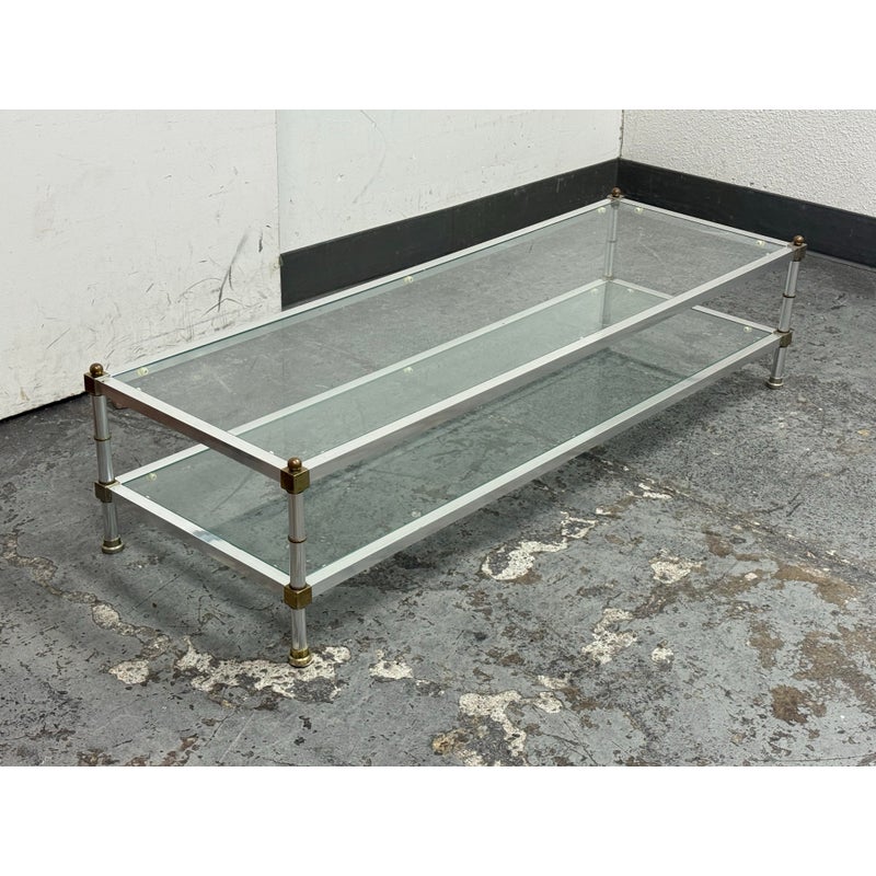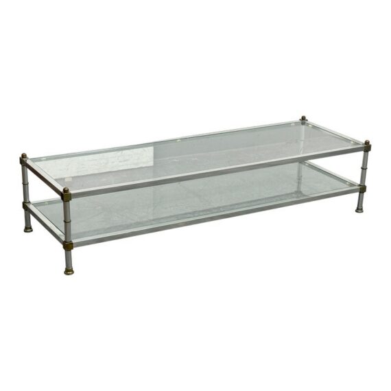 Design Plus Gallery presents a Mid 20th Century Coffee Table from Maison Jansen. The rectangular coffee table is defined by a silver metal frame accented with aged brass details at the corners and feet, creating a subtle contrast between the cool metal structure and the warmer brass elements. Two glass shelves are inset within the metal framework, offering transparency that highlights the linear construction from every angle. It is in good condition, visible patina and minimal scratches from usage. Made in France.
