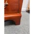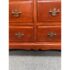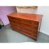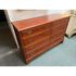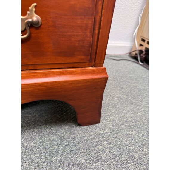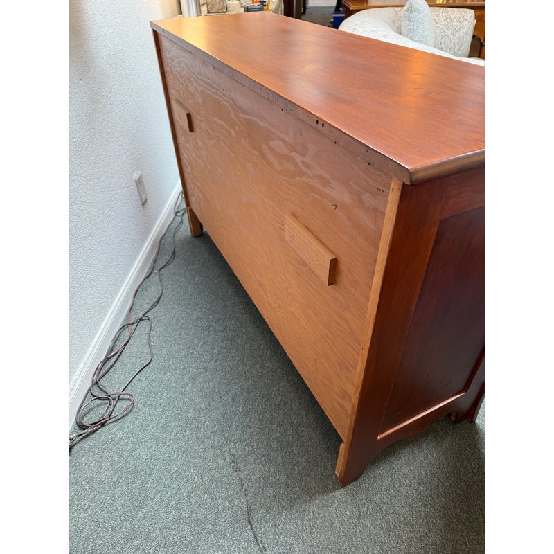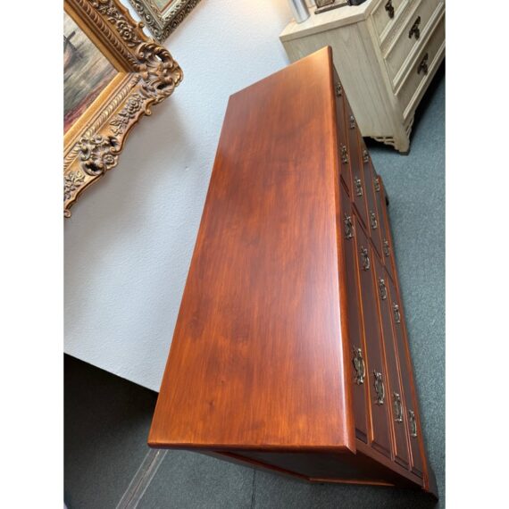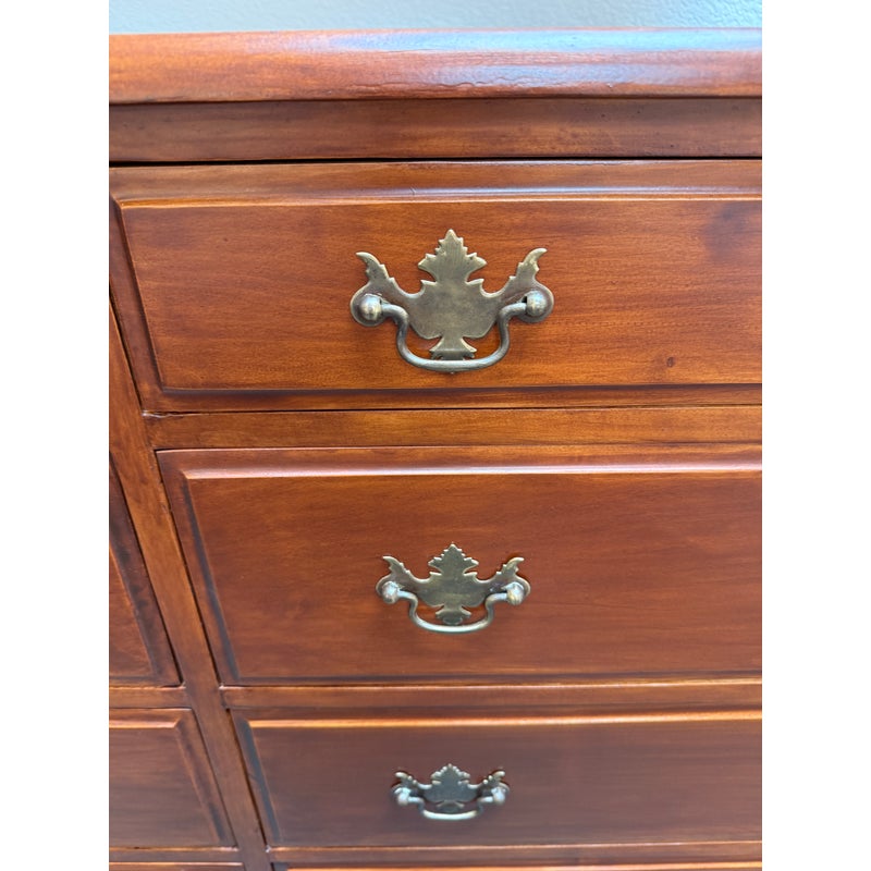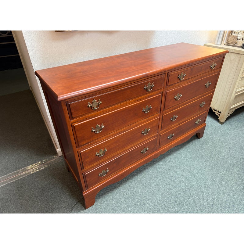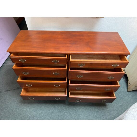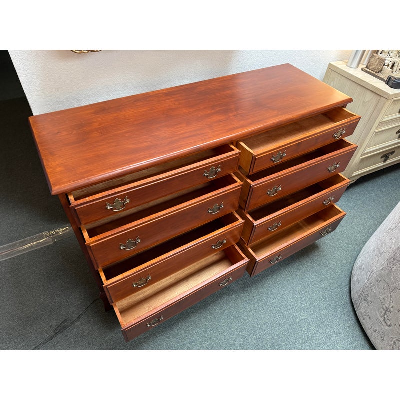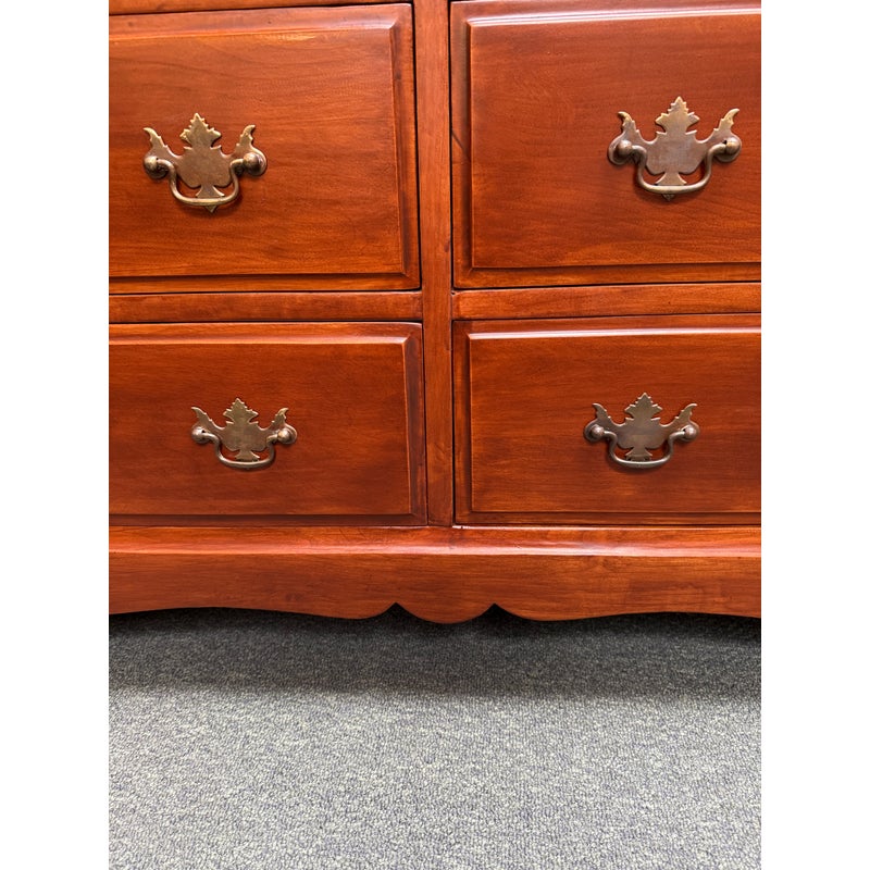 Design Plus Gallery presents a Double Dresser from the Mid 20th Century. The piece is solid and made from maple wood with an auburn stain, like a cherry wood finish. As a double dresser you get two sets of matching dressers, side by side, for a symmetrical display. There are a total of eight dovetailed drawers, four on each side, that are staggered in their depth. Each drawer has matching brass drawer pulls that are in the chippendale style. The dresser is in good condition for its vintage age + use.