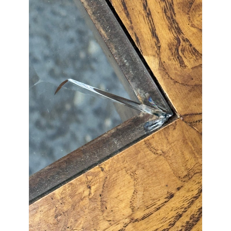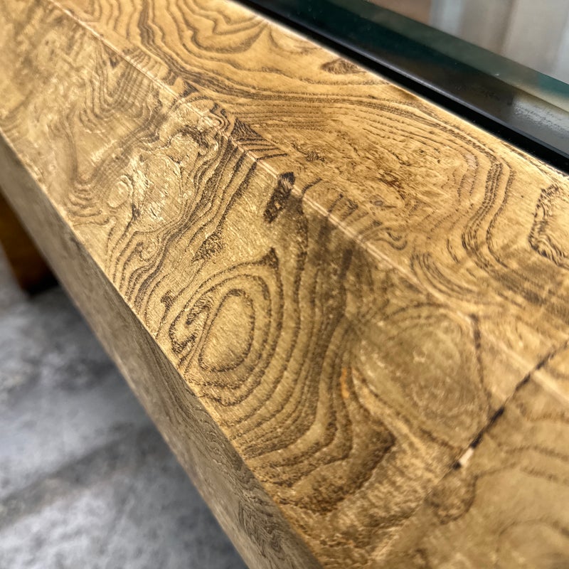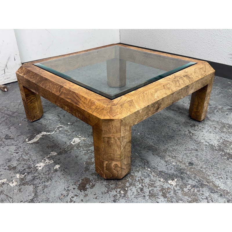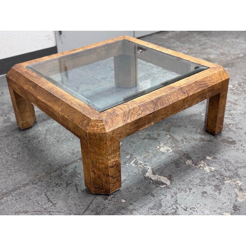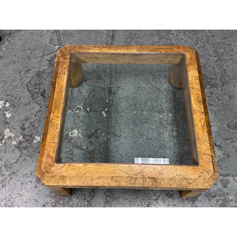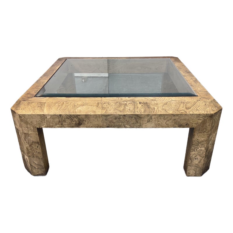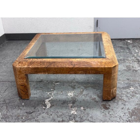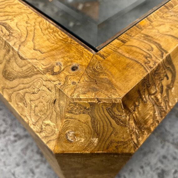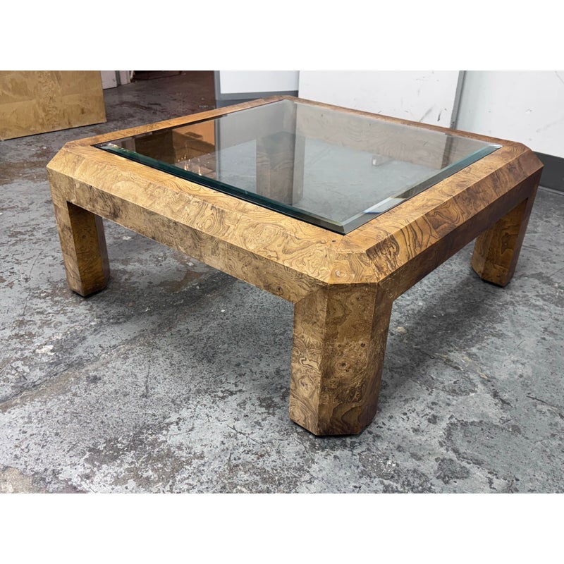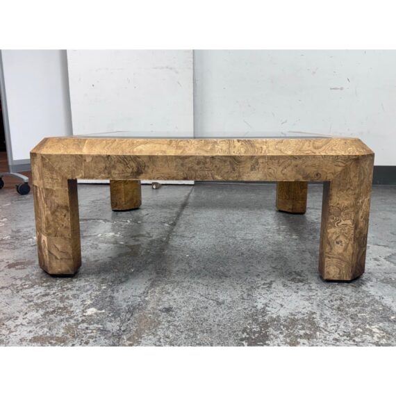 Design Plus Gallery presents a Burl Wood Coffee Table from the Mid 20th Century. The classic table is unique, durable and kid friends with its soft curved edges and beautiful design. The hand crafted table is a great blend of mid century to rustic style, with many in between aesthetics to fall into. The glass has some chips and minor cracks in the inset but overall the piece is in good condition for its usage.