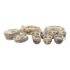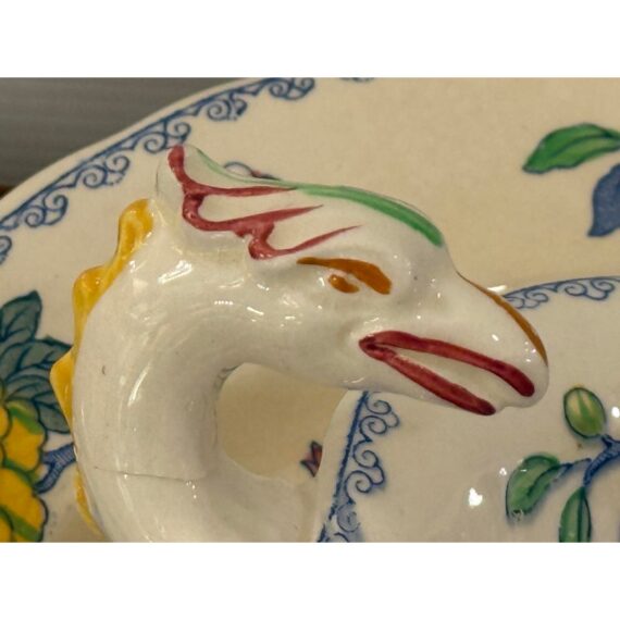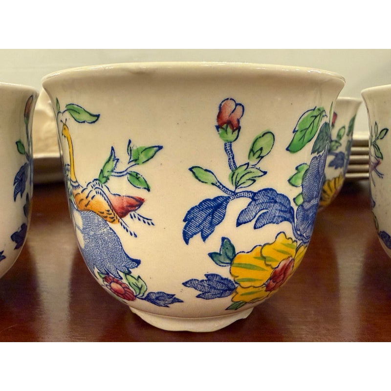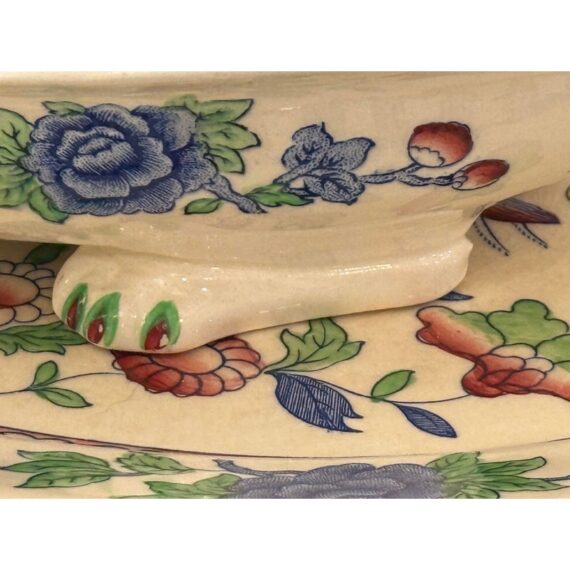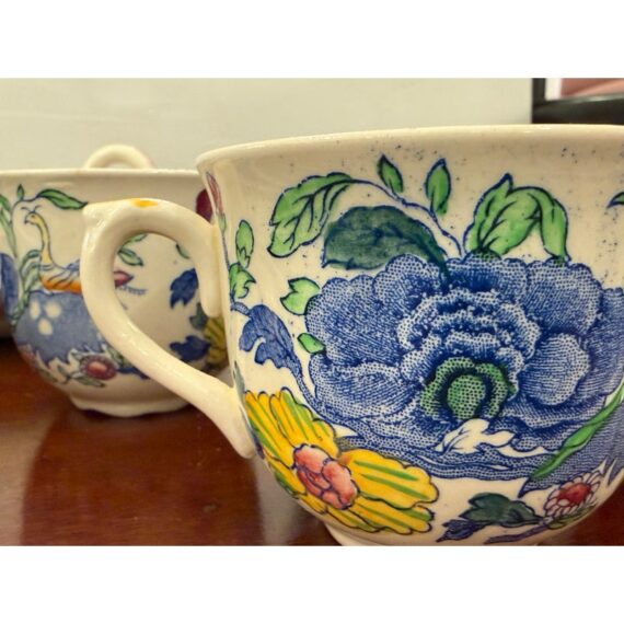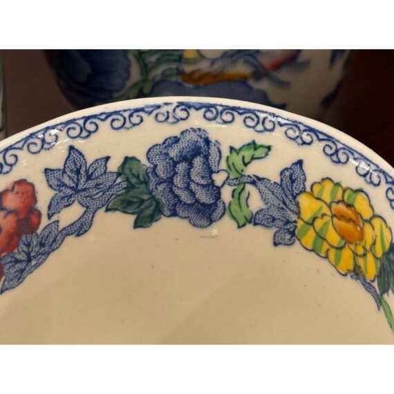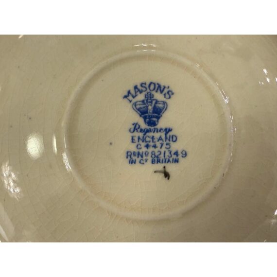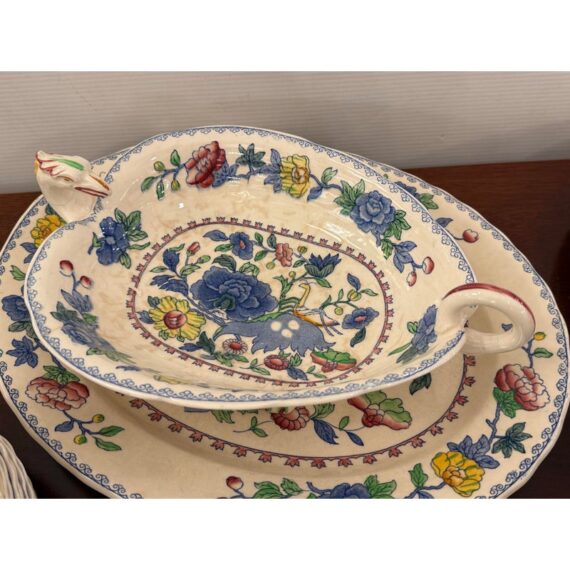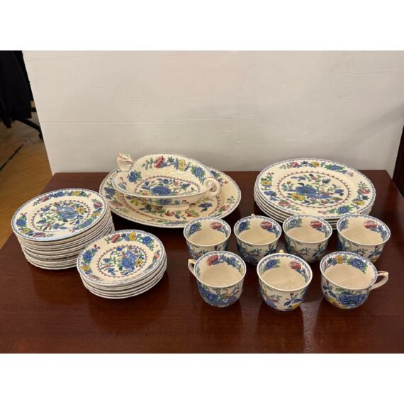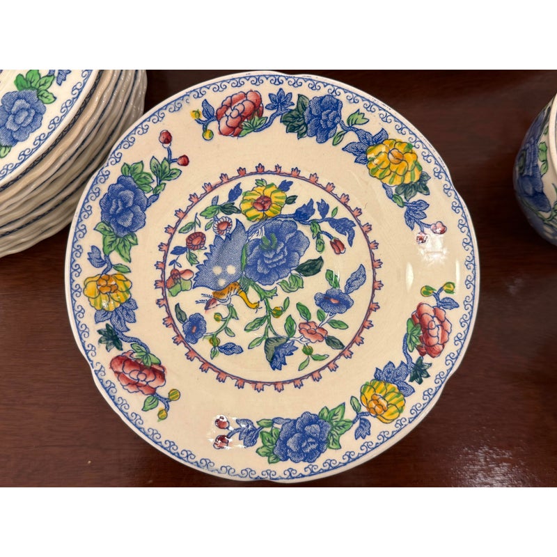 Design Plus Gallery presents a Set of Thirty-Five Pieces of Serving Dishes from the Plantation Collection from Mason’s Regency. The ironstone dinnerware is known for its durability and distinctive floral pattern in blues, yellows, greens, and mauves. The set offers five dinner plates, seven cups with their sauces for tea service, fourteen small bread or dessert plates, and a serving platter with serving bowl. The set is in good condition overall with wear that is consistent with usage. Made in the United Kingdom.