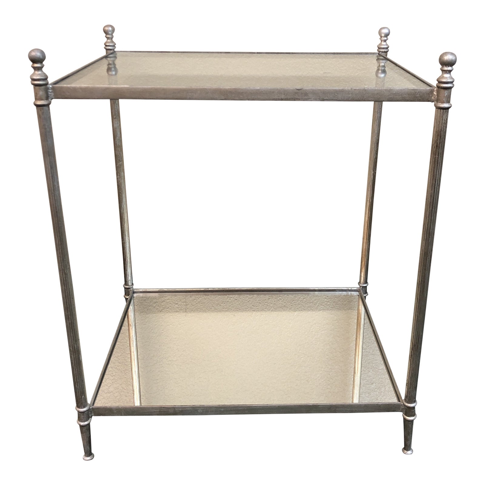 DesignPlus Gallery presents a Mid 20th Century Mirror + Glass Silver Side Table. Fine Silver pewter finish softly reflects this Maison Jenson inspired Side Table. Minor wear on frame. Mirrored bottom shelf and glass top surface give added layers to this small scale accompaniment for any sofa, accent chair or bed.
