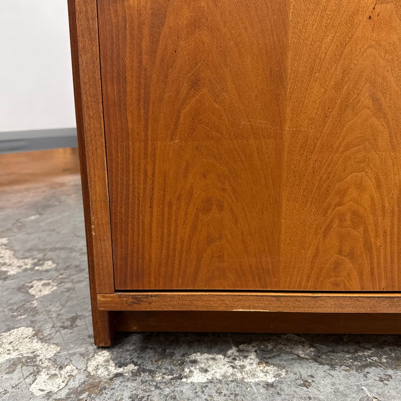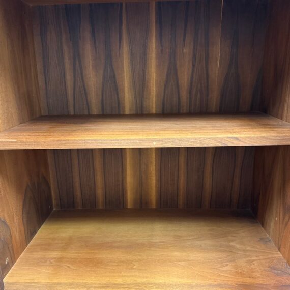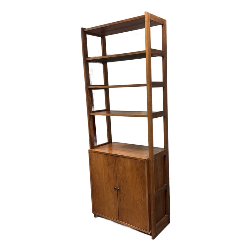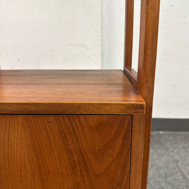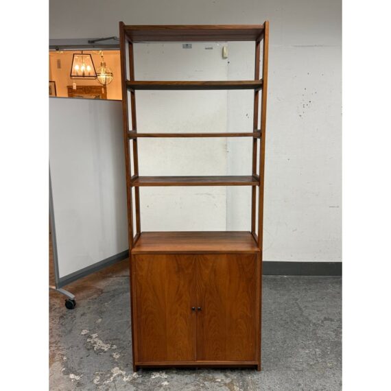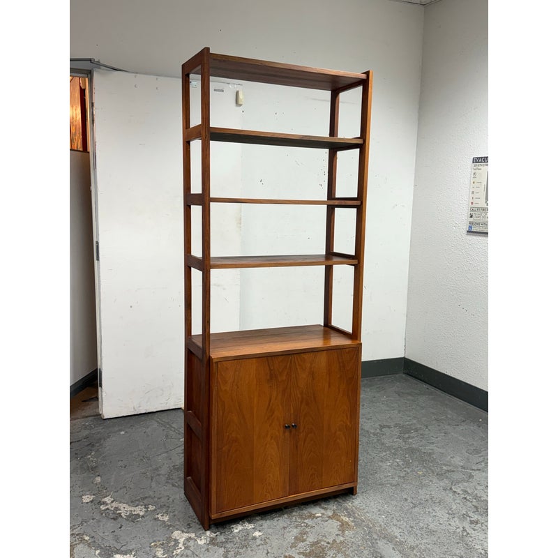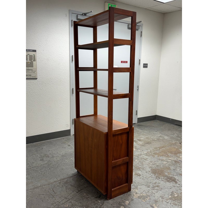 Design Plus Gallery presents a Book Case or Room Divider from the Mid 20th Century. The nice divider came as part of a grouping that has been split to appease whomever owns it next. The shelving unit with multiple shelves and an lower cavity with two cabinet doors that open to reveal an inner shelf in its cubby. There is visible wear to the base mainly and is considered to be in fair condition for its usage.