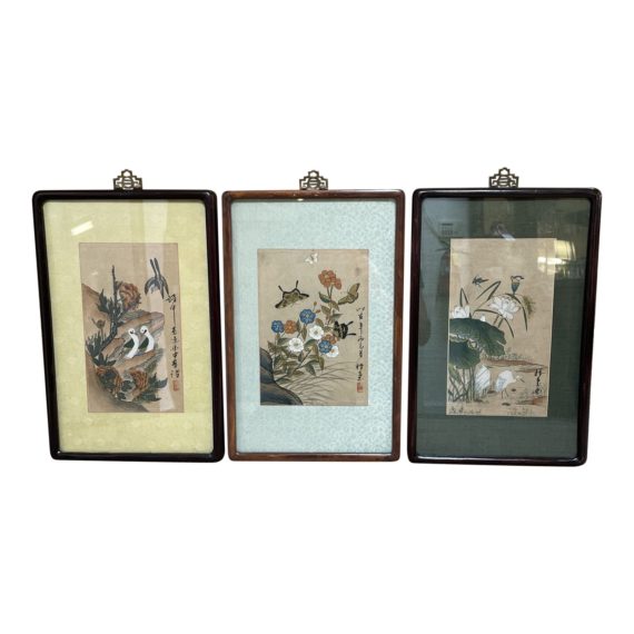 Design Plus Gallery presents a Trio of Vintage Japanese Paintings. Each of the three is a signed rendering of flora and fauna in a natural setting. Matted in three shades of silk jacquard, the paintings are framed in lacquered wood with brass fittings. Collected decades ago, and enjoyed for the same, now it is your turn.