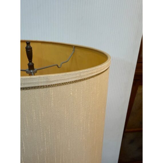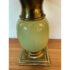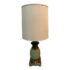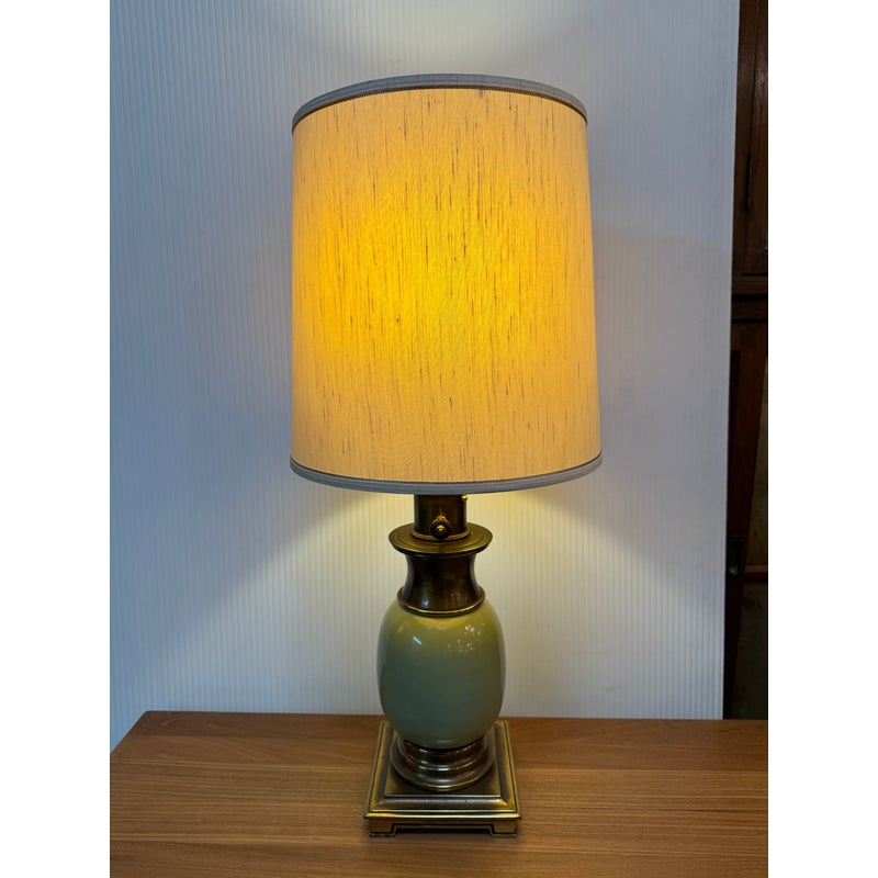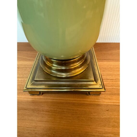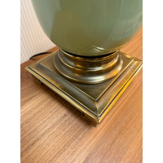 Design Plus Gallery presents an Ostrich Egg Table Lamp from the Mid 20th Century. This is a style of lamp based on the brand Stiffel created in the 1950-1960’s. It has a distinctive ceramic body shaped like an ostrich egg and an avocado green glaze. Its base and hardware is construction from brass and it has a long, cylindrical linen lamp shade to set the mood and attitude. It is in good condition with wear that is consistent with usage.