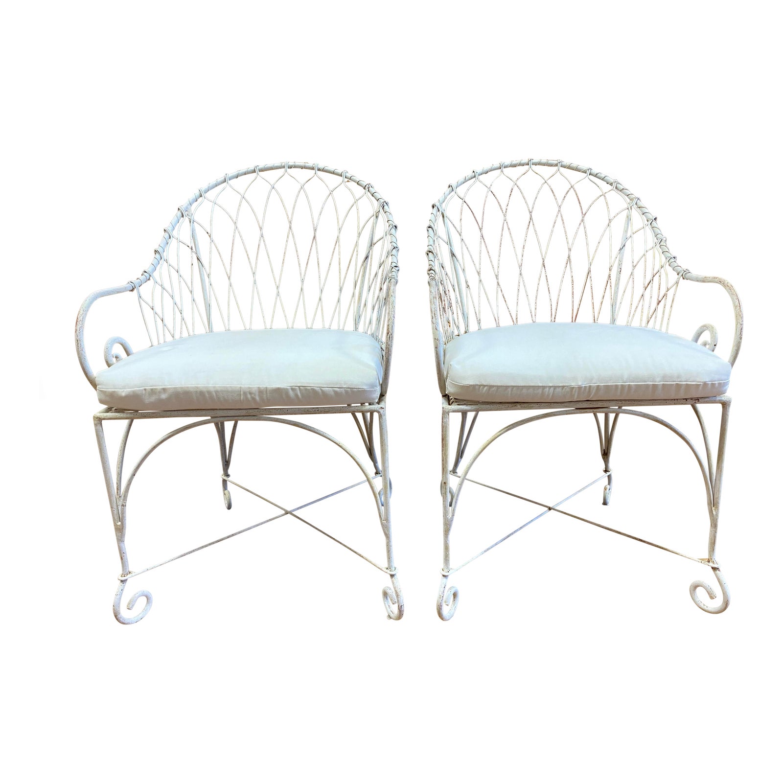 Design plus Gallery presents a pair of Mid 20th Century Outdoor Metal Chairs. Charming metal frame shows wear with a vintage shabby chic aesthetic. Chairs have been updated with a white outdoor cushion.