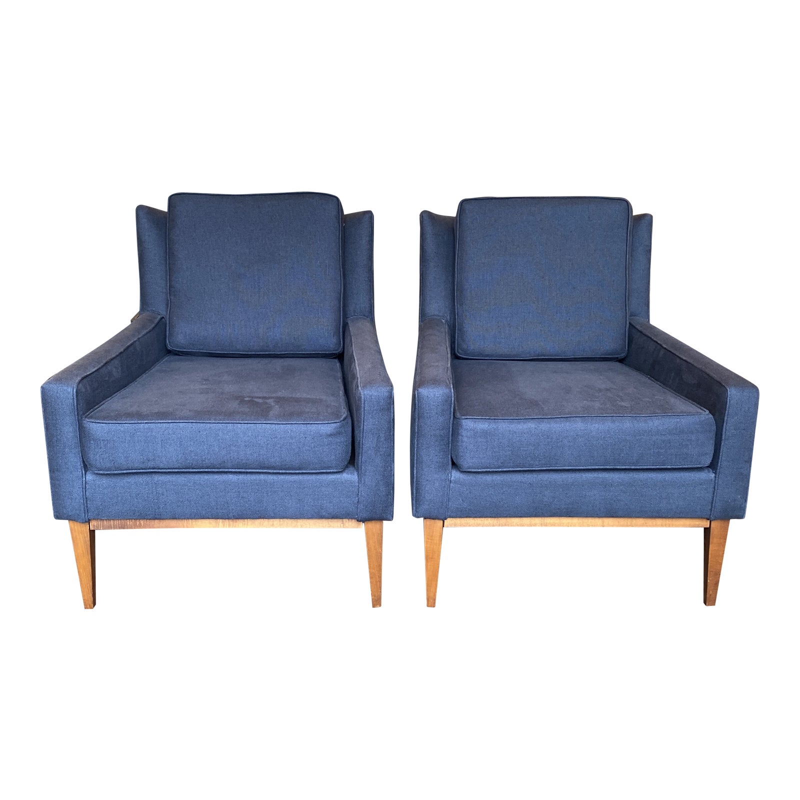 Design Plus Gallery presents a Pair of Mid 20th Century Arm Chairs. Attributed to world renown designer Paul McCobb. Reupholstered in a Restoration Hardware Belgian Linen in an Indigo color.