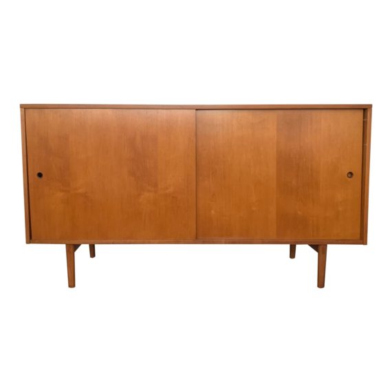 Design Plus Gallery presents a Paul McCobb Wooden Credenza for Calvin Furniture. Beautiful and rare Mid Century Credenza by Paul McCobb. Two sliding cabinet doors, with a total of 4 wood drawers with visible dovetail joints on wood glides on the inside as well as an adjustable (or removable) shelf. Visible wear on surfaces.