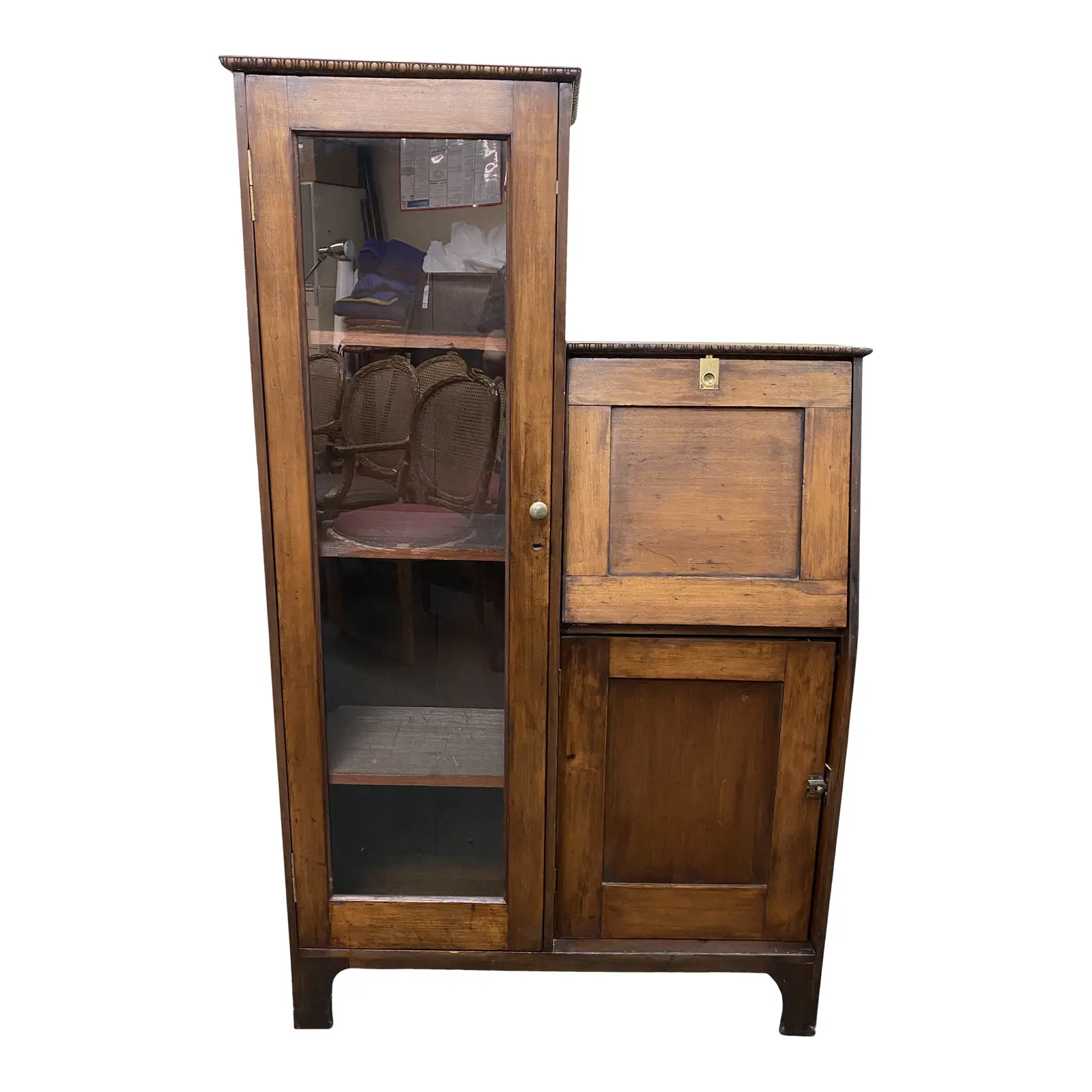 Design Plus Gallery presents an Antique Style Pine Glass Cabinet + Secretary. Solid wood craftsmanship is stained a rich Chestnut tone which accents all of the unique details and of this small scaled unit. Measuring only a foot in depth this piece is ideal for small interiors. Glass cabinet on the left comes with three adjustable shelves. Right side of the unit has a single cabinet which anchors a petite drop down secretary desk with five compartments for organizing. Brass hardware gives additional vintage charm. Minor wear.