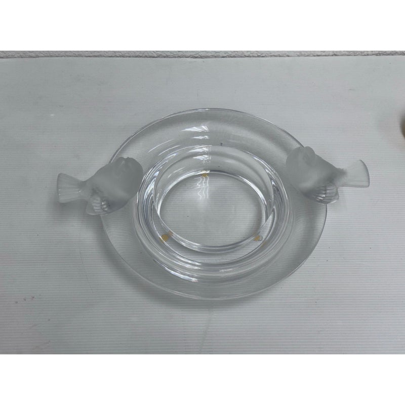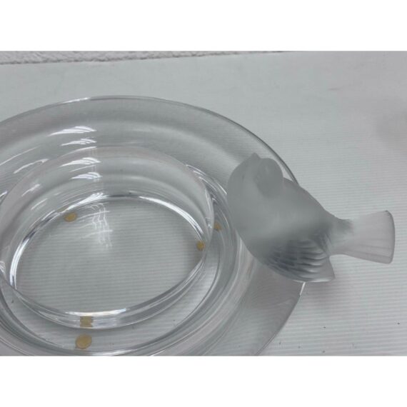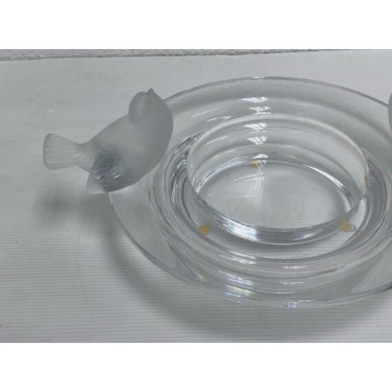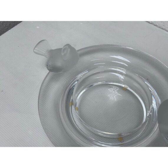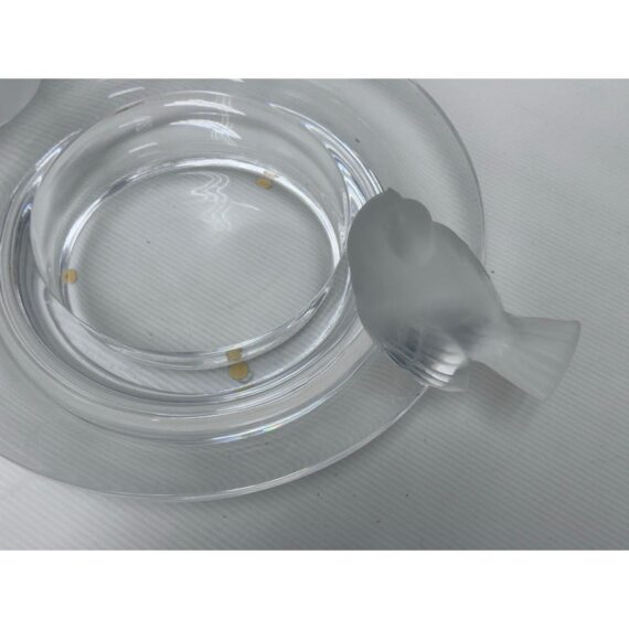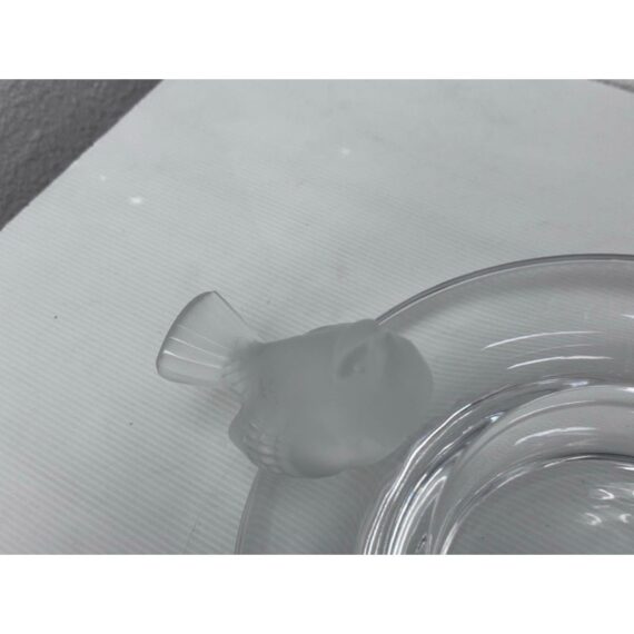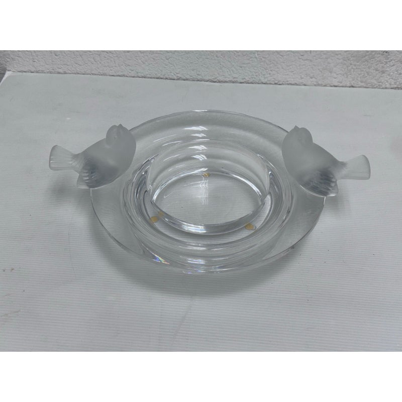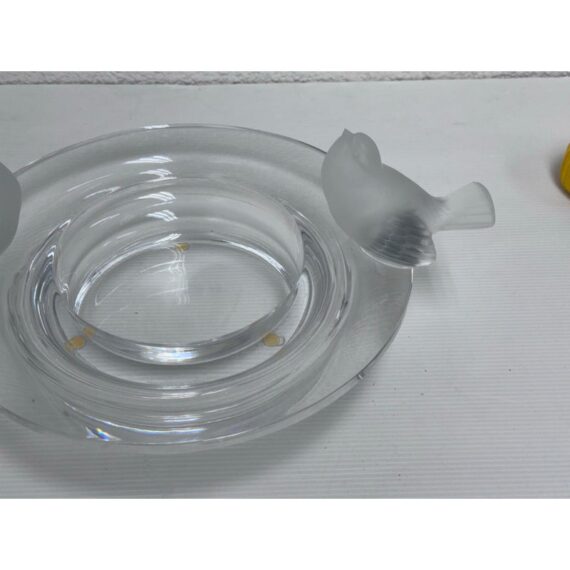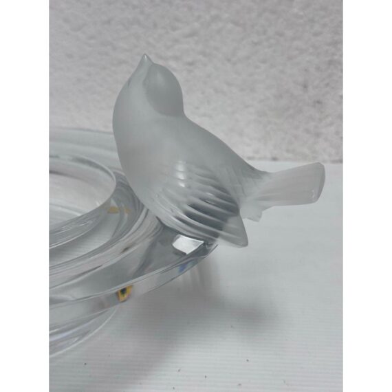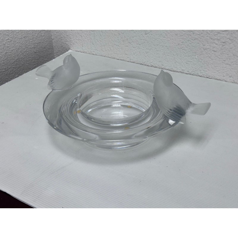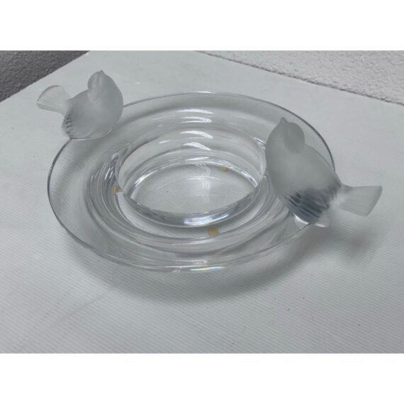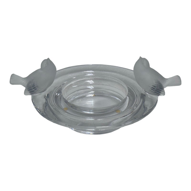 Design Plus Gallery presents the Deux Moineaux Moqueurs Bowl by Rene Lalique from the 1960s. The bowl is so sweet + pleasant with a broad rim displaying all year sparrows perched on said rim on either side of the bowl. Made of frosted and satin crystal, the centerpiece is in the unmistakable Art Deco style Truly majestic. Is in good condition for its vintage age. Minor minimal breakage under one bird beak.