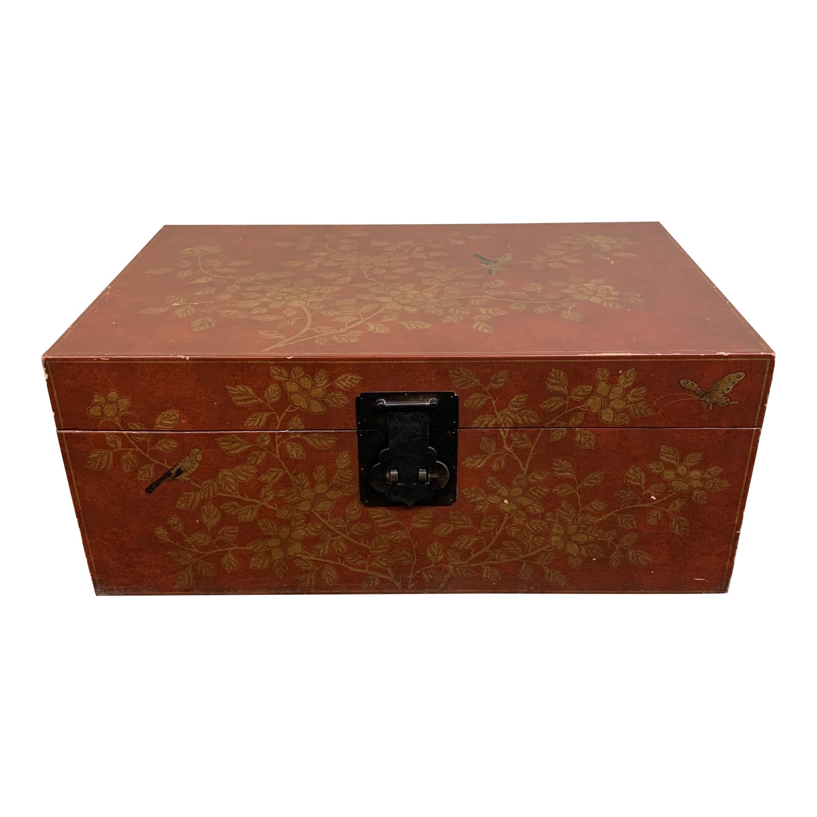 Design Plus Gallery presents a Mid-20th Century Red + Gold Asian Chest. Interior Leather construction with hand painted exterior. Gold chinoiserie is applied on top of the tipped red background. Oiled brass latch is missing the original pin to the front. Handles match the front latch for added movability. Visible wear and distress on the surfaces of chest.