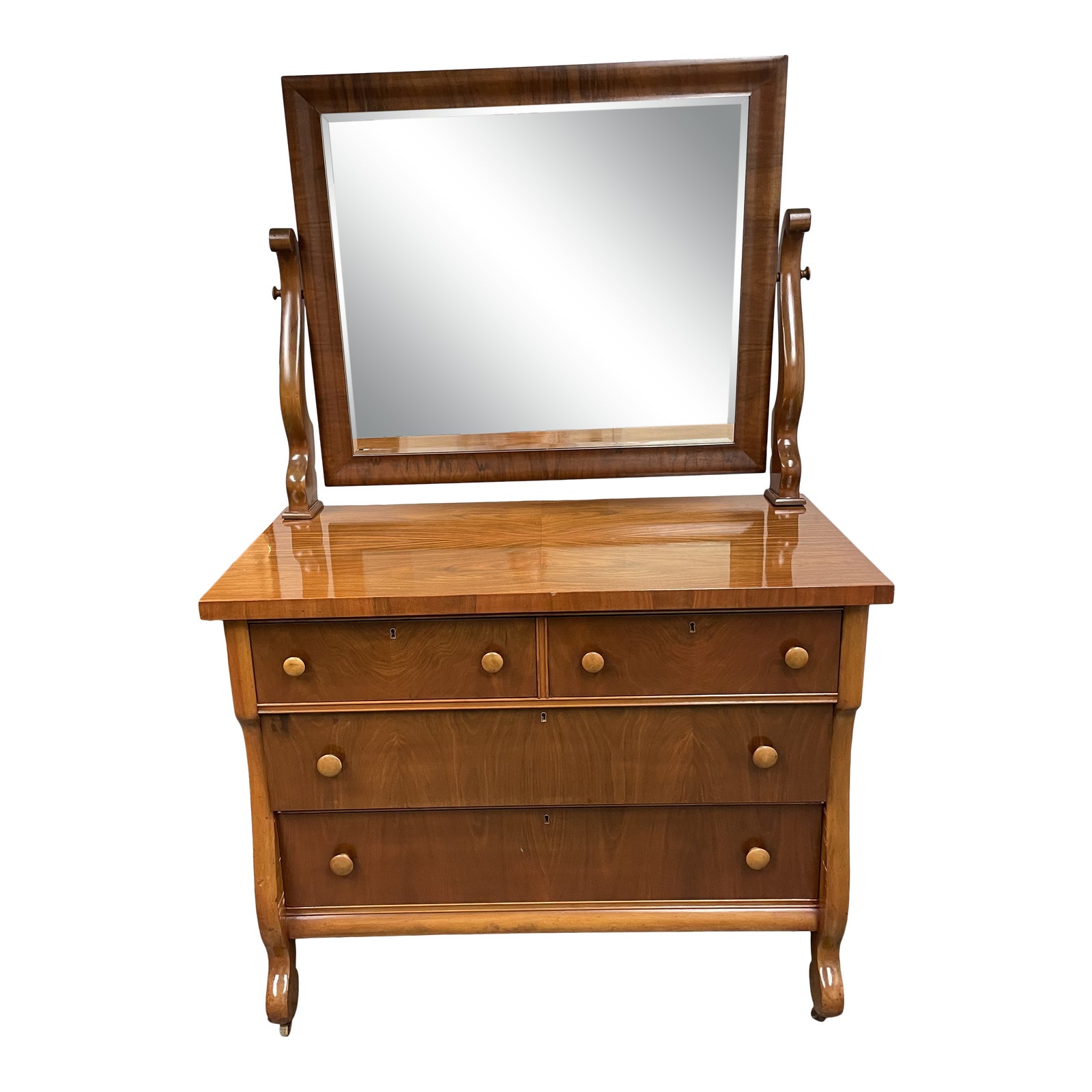 Design Plus Gallery presents a Mid 20th Century Reinert & Riley Tiger Flame Oak Four Drawer Highboy. Custom made from one of San Francisco’s staple early 20th-Century Custom Furniture shops. Tiger flame veneers are beautifully inlaid on this uniquely narrow and tall storage system. Top comes with a tilting mirror. Mirror is a little wobbly and could use reinforcement. Comes with original castor legs, however the key for the drawers is missing and they could use stoppers. Good condition. Visible and minor wear with usage and age. This one of a kind piece gives old world charm to any bedroom or dressing room space.