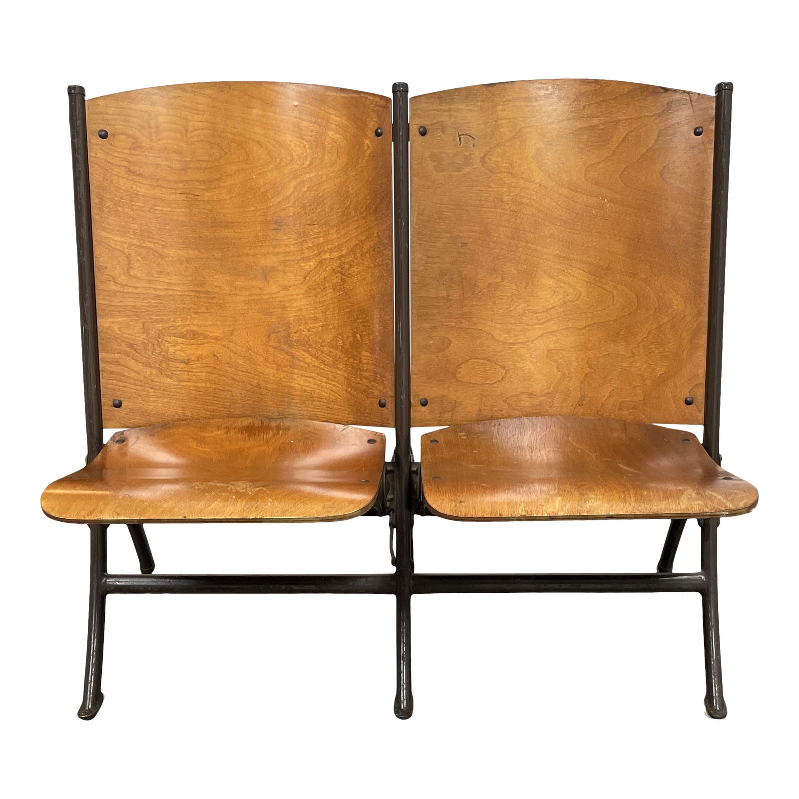 Design Plus Gallery presents a pair of Mid 20th Century theater seat benches. Retired from their historic home at the San Francisco Mariners Union, making these pieces a unique part of San Francisco history. This bench with twi seats each are an ideal choice for your foyer or entryway for taking off shoes or briefly settling in. A sturdy metal stand has a small footprint when both seats are recessed.