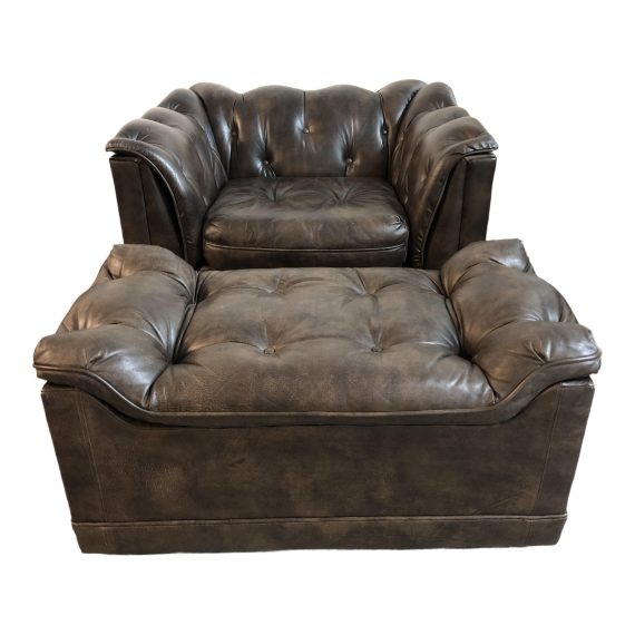 Mid-20th Century Schafer Bros Tufted Leather Chair + Ottoman