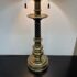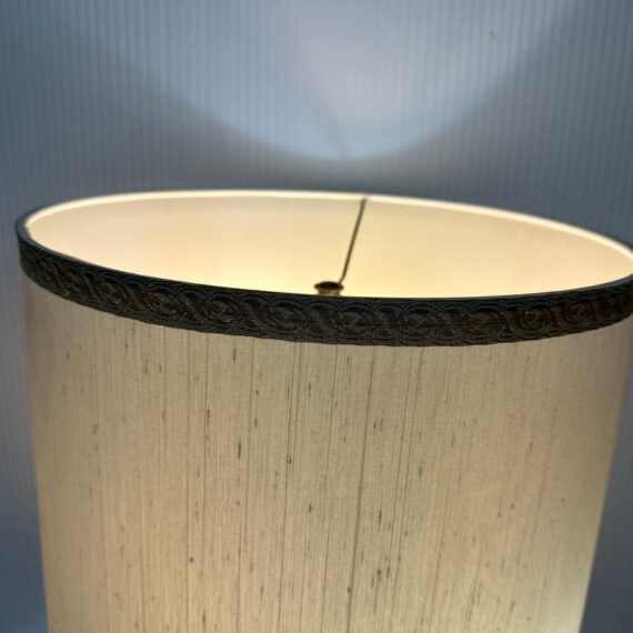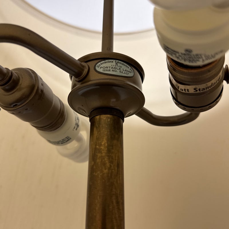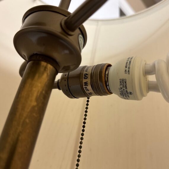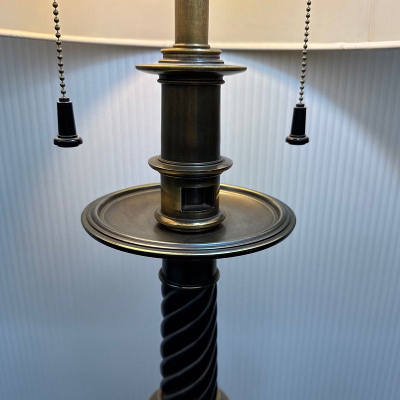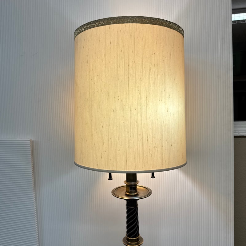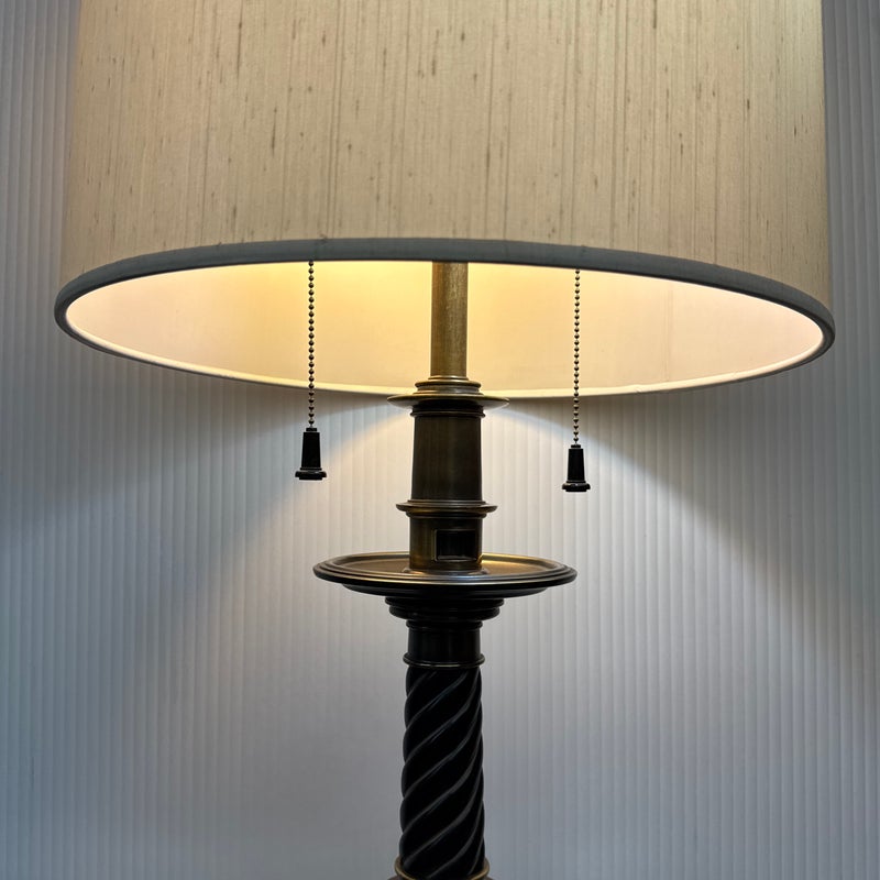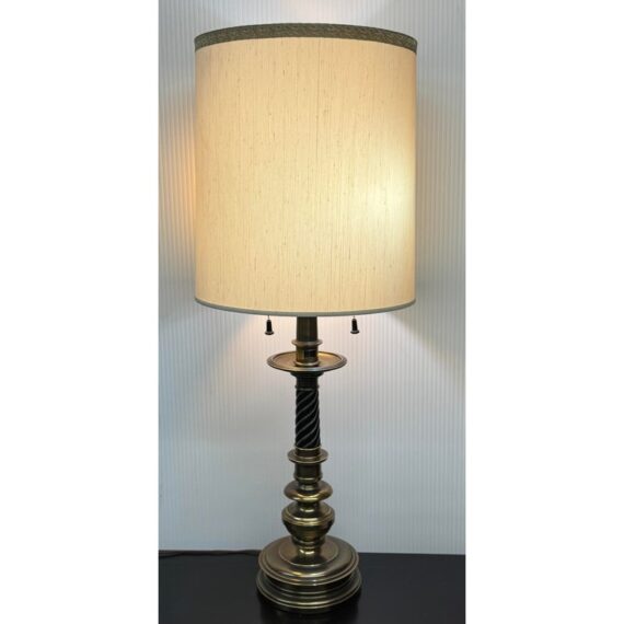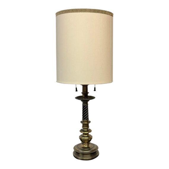 Design Plus Gallery presents a Brass Table Lamp from Stiffel. The lamp has a timeless design style that originated in the Mid 20th Century in North America. The base is of heavy cast brass with two bulbs with chain pulls operating each. The light is diffused with a linen drum lamp shade that has a unique presence on its own. All parts are intact and original. The lamp shows signs of wear that is consistent with its vintage age such as patina to the metal.